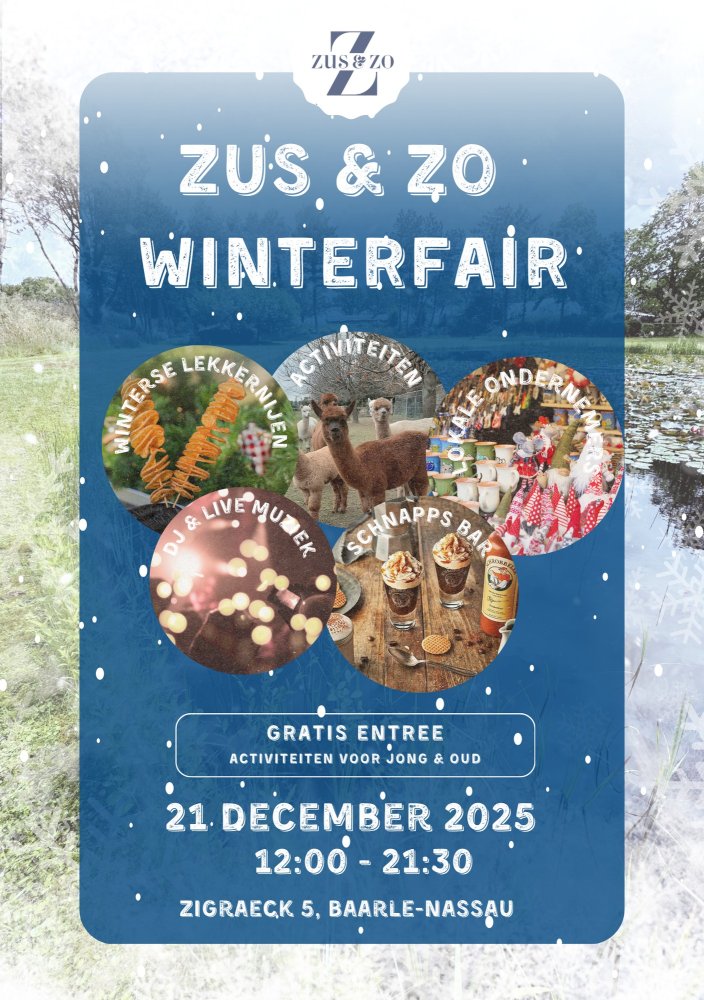 Kom op 21 december naar de Winterfair bij Zus & Zo Borrels en Bites. De gehele dag zijn er voor jong en oud verschillende activiteiten, winterse lekkernijen, schnapps bar en live muziek. Lees verder