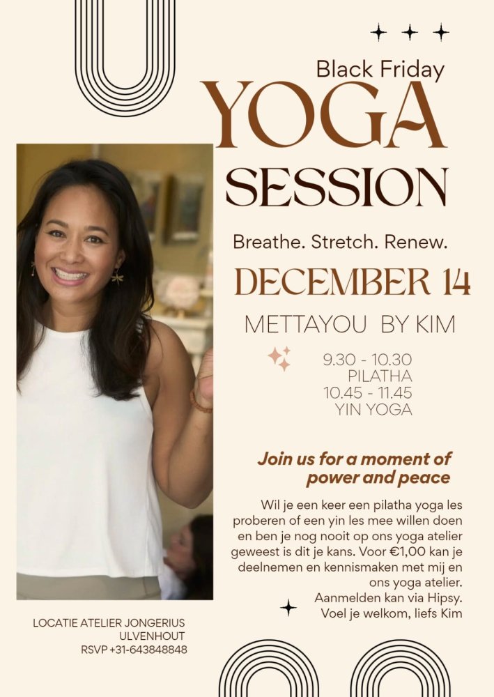 Wil je een keer een pilatha yoga les proberen of een yin les mee willen doen en ben je nog nooit op ons yoga atelier geweest is dit je kans. Voor maar €1,- kan je deelnemen en kennismaken met mij en ons yoga atelier.