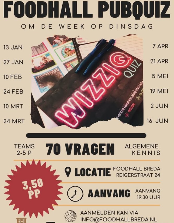 Foodhall Pubquiz dinsdag, 10 februari 19:30 Foodhall Breda Ook in 2026 knallen we weer met quizavonden bij foodhallbreda! Om de week op dinsdag Lees verder Ook in 2026 knallen we weer met quizavonden bij foodhallbreda!Om de week op dinsdagVanaf 19:30 (€3,50 p.p.) Reigerstraat 24, 4811 XB Breda
