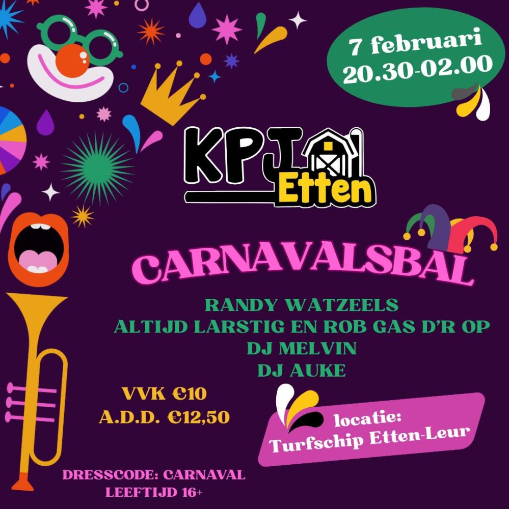 KPJ Carnavalsbal in Het Turfschip zaterdag, 7 februari 20:30 Het Turfschip Etten-Leur Met: Randy Watzeels, Altijd Lastig en Gas d'r Op en DJ Melvin en DJ Auke Lees verder KPJ Etten houdt op 7 februari een groot carnavalsbal in Het Turfschip. Van 20.30-02.00 uur.Met: Randy Watzeels, Altijd Lastig en Gas d'r Op en DJ Melvin en DJ Auke. Leeftijd 16+.Voorverkoop 10 euro, aan de deur 12 euro 50.Tickets>> Schipperstraat 2, 4871 KK Etten-Leur