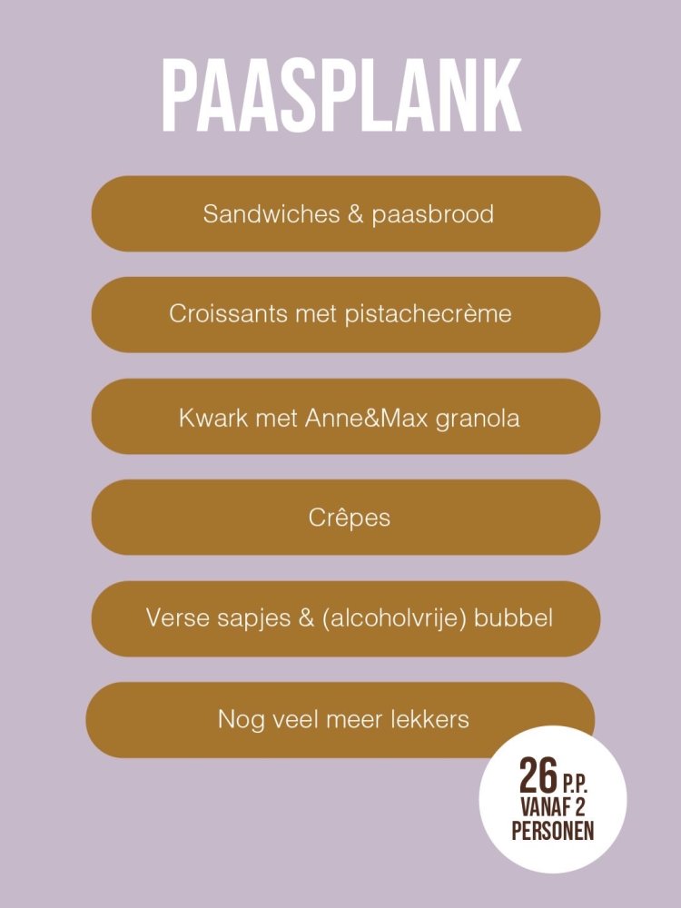 Op beide Paasdagen kun je hier genieten van een heerlijke brunchplank. Op deze plank zit alles waar jij op je Paasdag van wil genieten: paasbrood, yoghurt met vers fruit, roerei, crêpes, verse sapjes en nog meer lekkers π₯π«β