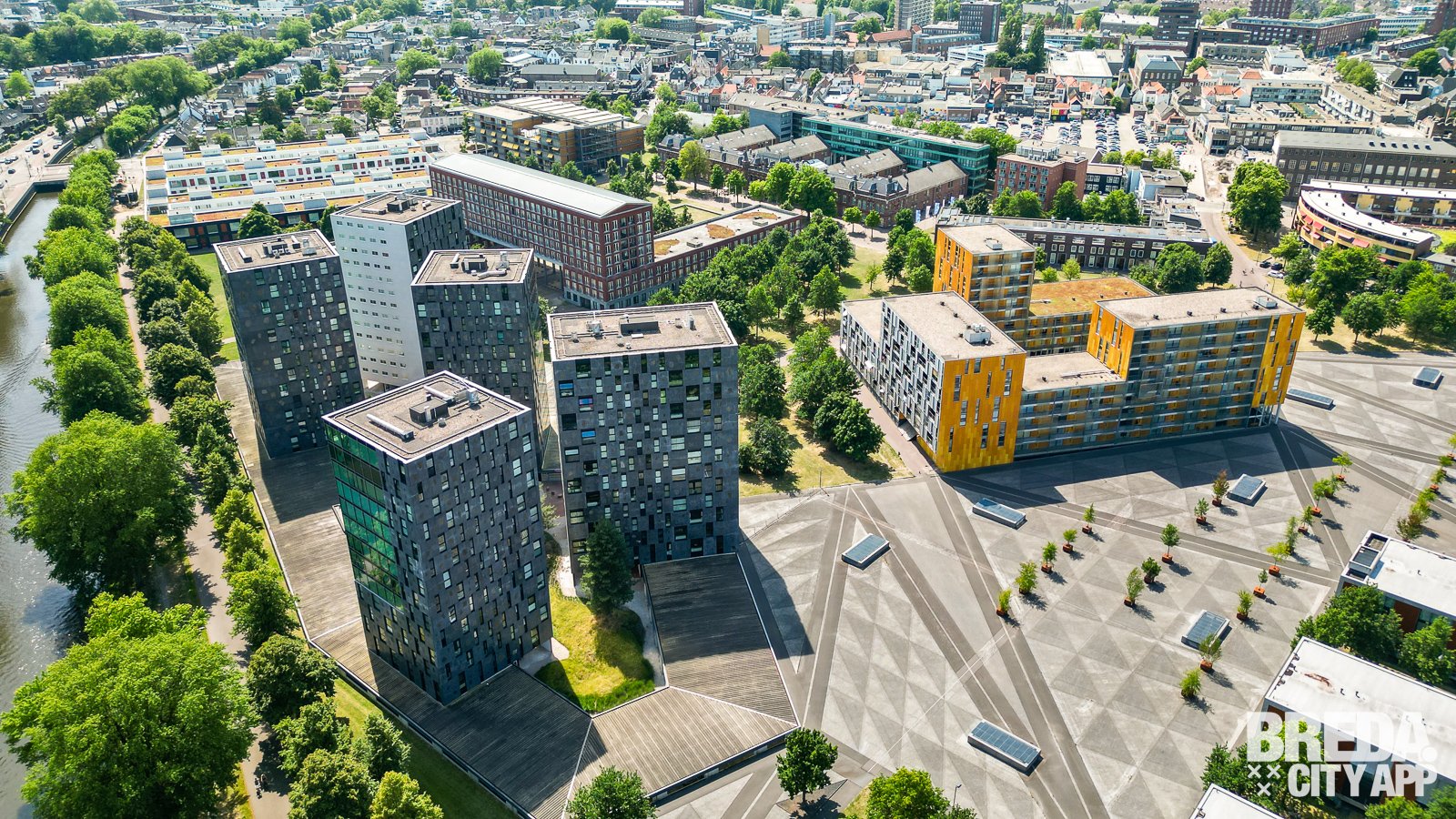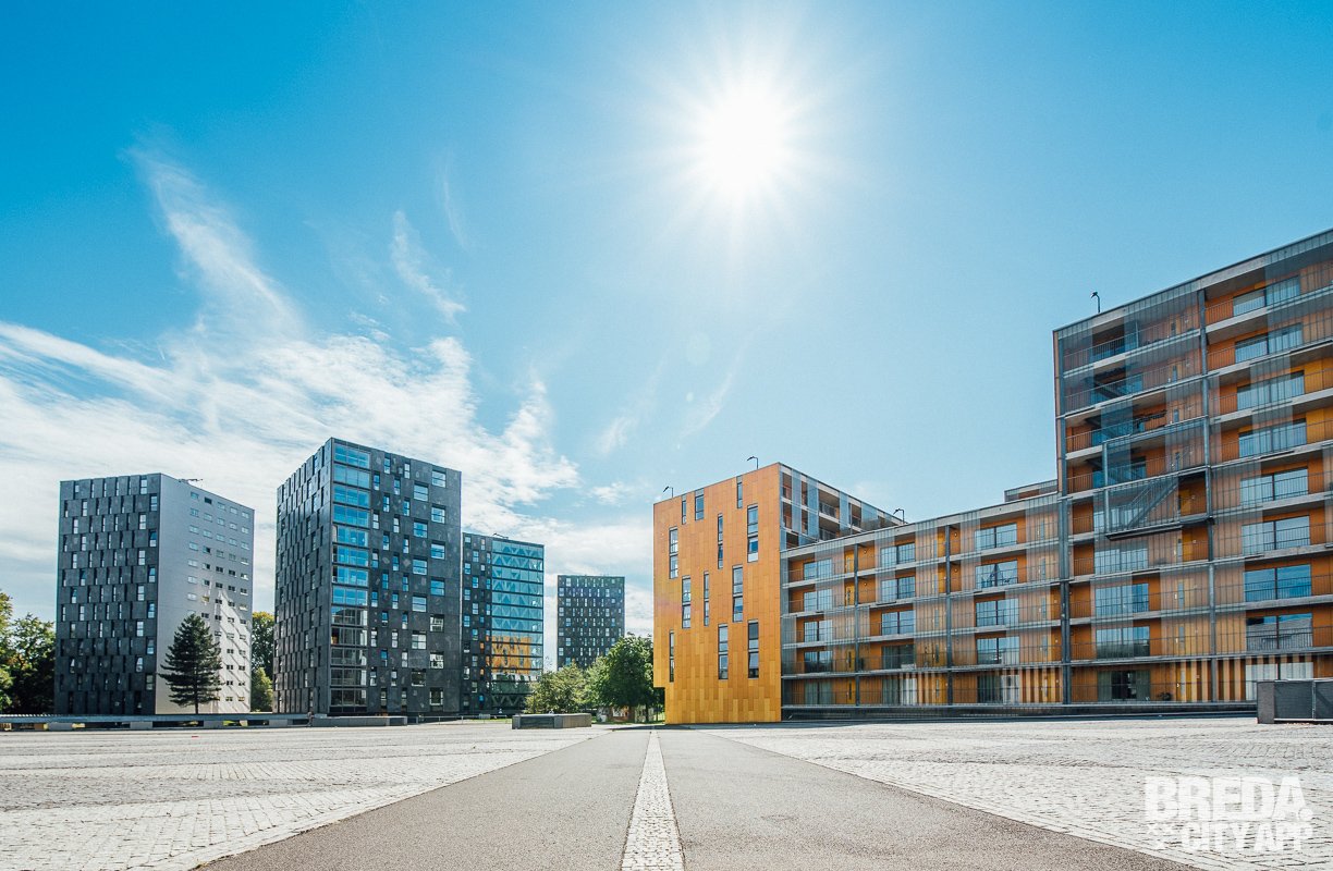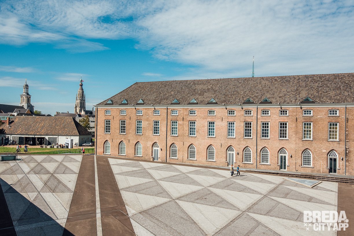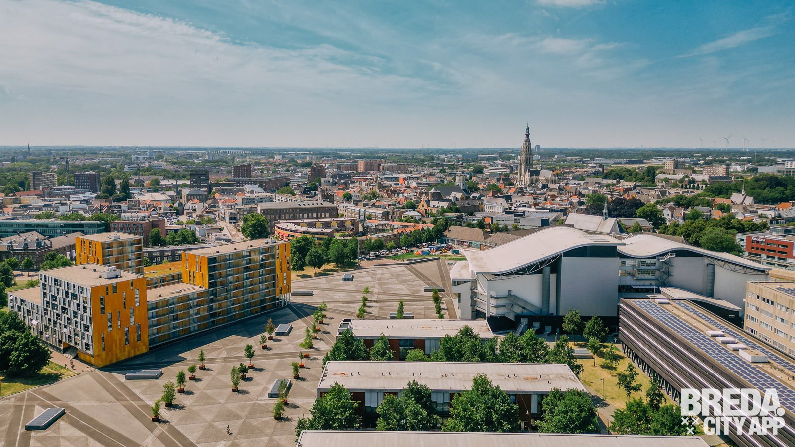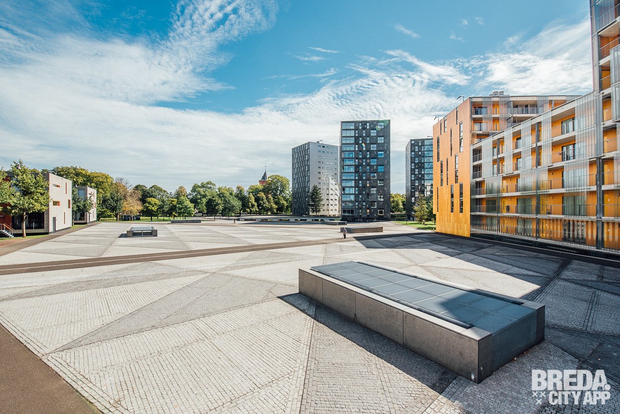 Vanuit het Chassépark heb je niet alleen een mooi uitzicht op de moderne architectuur, maar ook op de sky-line van Breda met de Grote Kerk.