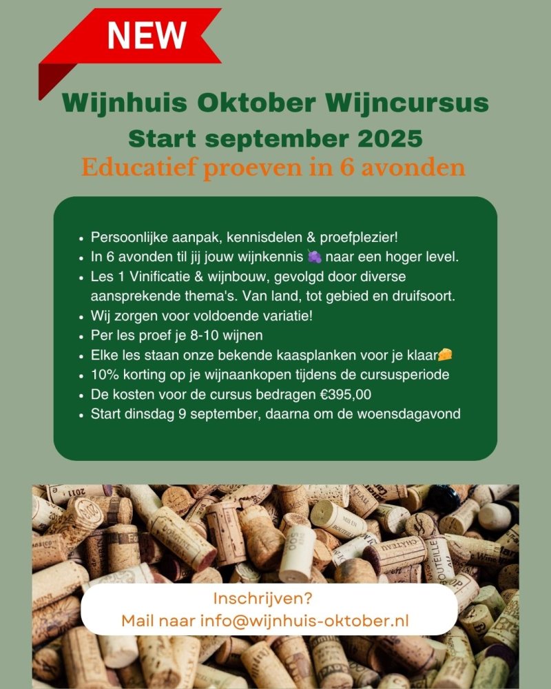 Wijncursus - Wijnhuis Oktober Wijnhuis Oktober Educatief proeven in 6 avonden! Lees verder Soort uitje Eten & drinken Wilhelminastraat 52, 4818 SH Breda www.wijnhuis-oktober.nl 076 521 8125 info@wijnhuis-oktober.nl