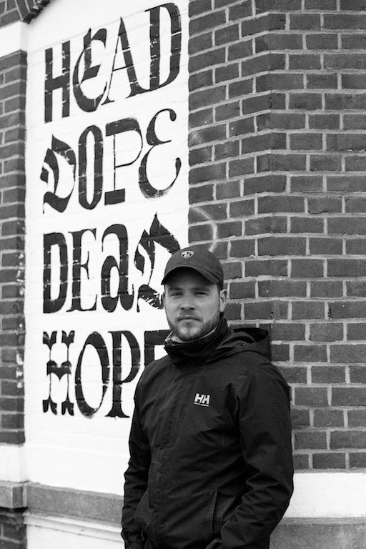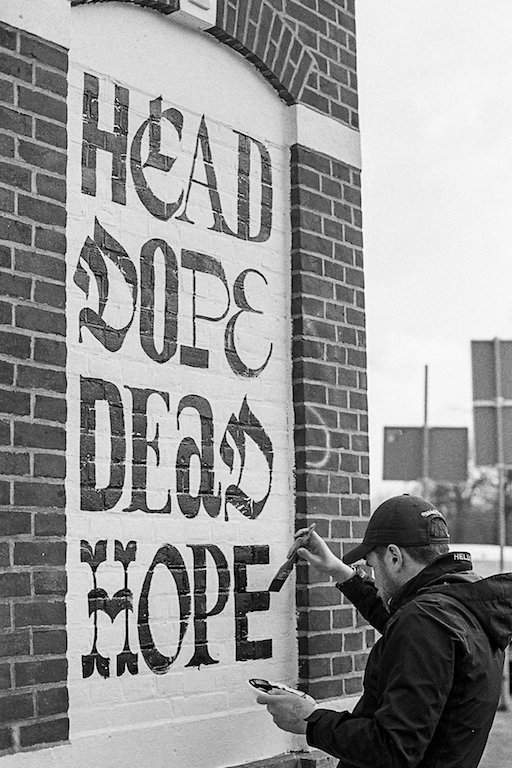 Na het maken van de schildering hoorden we het verhaal van twee vrienden die bijna 26 jaar hebben gevochten tegen hun alcoholverslaving. Eén van de mannen is in 2016 verongelukt tijdens een psychose en is een aantal dagen later aan zijn verwondingen overleden. Hij woonde in de kamer boven de tekst die Guido op de gevel heeft geschilderd. Dit verhaal geeft de tekst ‘Head Dope Dead Hope’ een extra lading.