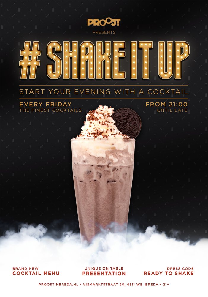 Elke vrijdagavond vanaf 21.00 uur kun je als cocktailliefhebber genieten van een goede cocktail maar ook van verschillende gin-tonics. Tijdens ShakeItUp! kun je verschillende originele cocktails proeven zoals de Oreo Cocktail, Aviationof Magic Mojito, én geniet je tegelijkertijd van een unieke presentatie. Proost heeft ervoor gekozen om een team van cocktailshakers weg te zetten die naast het maken van de verschillende heerlijke cocktails ook een verrassende presentatie kunnen weggeven aan tafel.