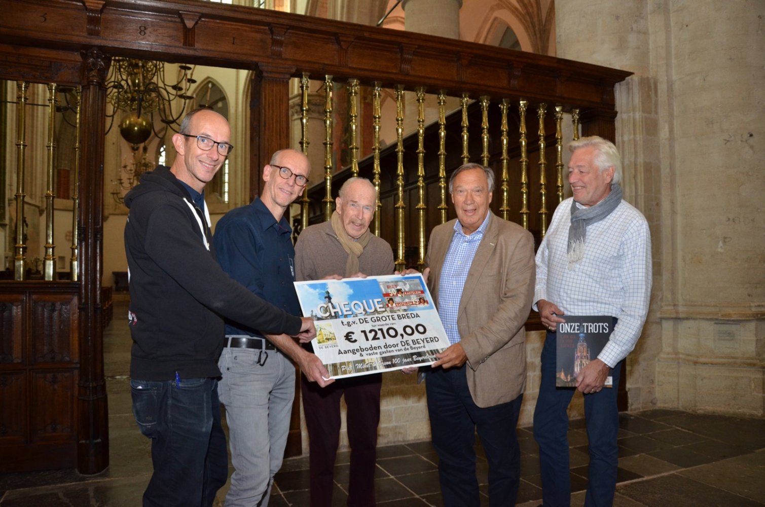 Café de Beyerd doet dat dus op zijn eigen wijze: de gasten van de Beyerd doneerden in totaal maar liefst € 1219,- voor de Grote Kerk. Die gift werd vorige week door de drie eigenaars van De Beyerd overhandigd aan Eric Westenburg, de huidige voorzitter van de Vrienden van de Grote Kerk en Hans Canters, de aankomend voorzitter. Eric Westenburg: ‘Dit is natuurlijk een geweldig mooie geste van Café de Beyerd. We hopen dat we in ons jubileumjaar heel veel nieuwe Vrienden kunnen werven, maar spontane acties zoals deze zijn natuurlijk ook meer dan welkom. Het laat weer eens zien dat de Grote Kerk breed gedragen wordt in Breda, in de harten van de mensen zit. Petje af voor de gasten en eigenaars van De Beyerd’.