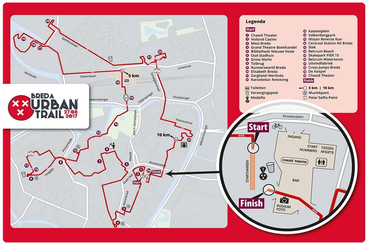 Het Chassé Theater is zowel start- als finishlocatie van het evenement. Hier kunnen deelnemers gratis hun tas achterlaten en het startnummer ophalen (vanaf 8.00 uur). Het parcours doet vervolgens het Holland Casino, de Mezz, het Grand Theater Boekhandel, de Bibliotheek Nieuwe Veste, het oude Stadhuis, de Grote Markt, Tolbrugstraat, de winkel van Runnersworld, zorghotel Merlinde, Karaokebar Ameezing, het Kasteelplein, het Valkenbergpark, het Station, STEK, Belcrum Beach, Pier 15, Belcrum Watertoren, UItvindfabrier, Cross Jumps en de Koepel aan.