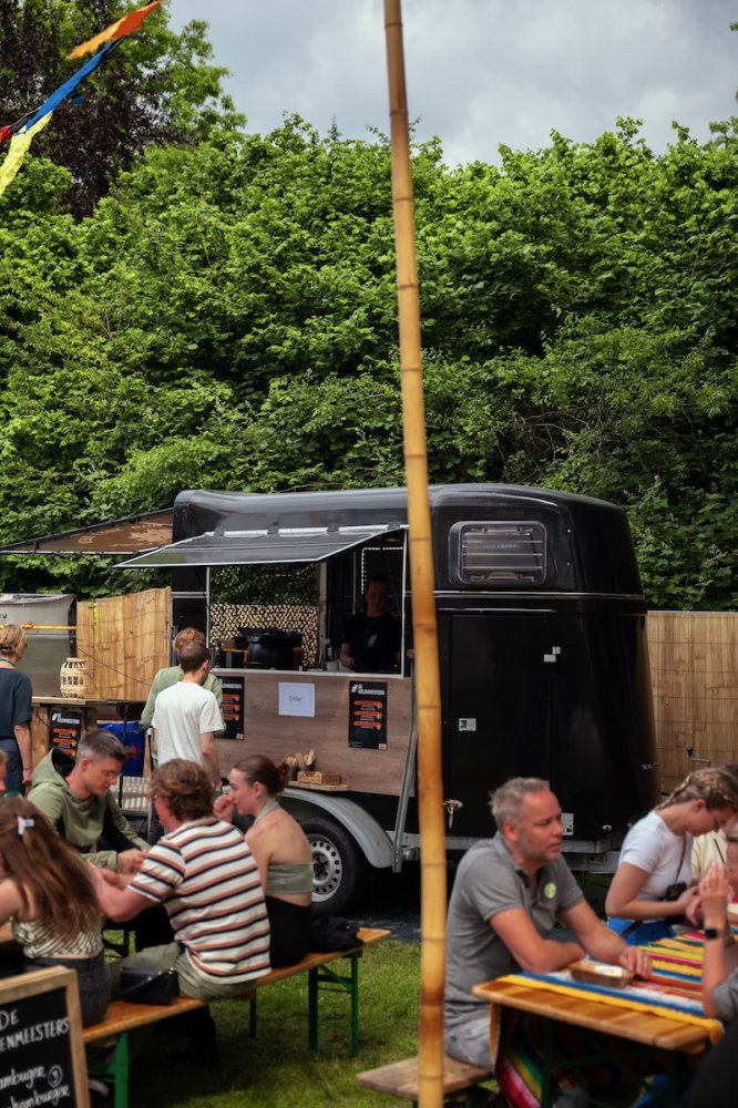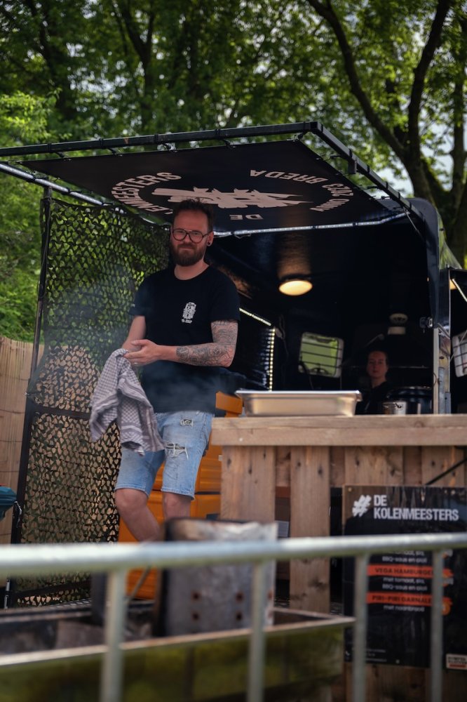 Eerder hadden zij al eens een omgebouwde paardentrailer geleend voor een cateringklus, en dat beviel uitstekend. Dit bracht hen op het idee om op zoek te gaan naar een eigen paardentrailer. Zo kwamen ze deze parel tegen – het was bijna liefde op het eerste gezicht. Ze hebben de trailer volledig gestript en opnieuw ingericht, zodat hij perfect aansluit op hun manier van werken. Aan beide zijkanten zijn luiken aangebracht die omhoog kunnen. In de punt van de wagen is een frituur geplaatst met daarboven een afzuigkap. Ook zijn er twee verrijdbare kasten toegevoegd, die zowel binnen als buiten gebruikt kunnen worden. De achterklep is voorzien van twee poten, waardoor deze gelijkvloers komt met de wagen – ideaal voor het plaatsen van de BBQ. Dit zorgt voor gemak en flexibiliteit bij elke cateringklus. Boven de BBQ hangt een banner die beschutting biedt tegen de regen.