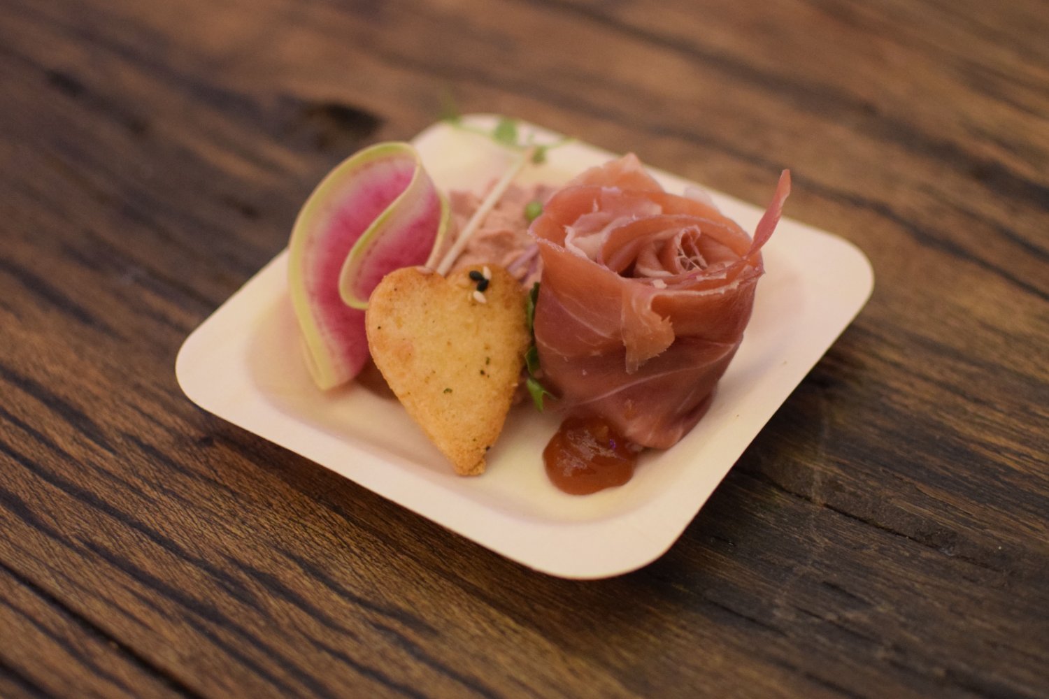 De romige likkepot gaat goed met het hartvormige krokantje. De rozenconfiture heeft een subtiele zoete smaak welke erg mooi samen gaat met het zoute van de serranoham. Het geheel werd versierd met een frisse Japanse radijs.