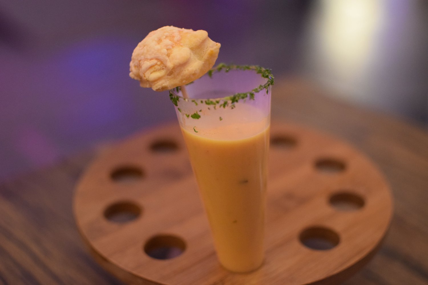 Tussengerecht: zachte pompoensoep met chermoula en een kaasbloem