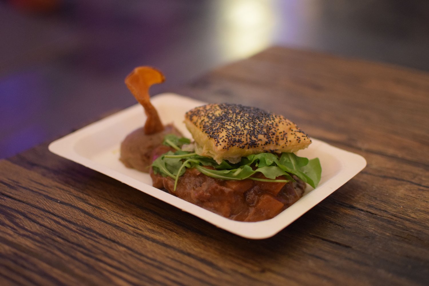Het krokante jasje is gemaakt van luchtig bladerdeeg samen met maanzaad. Het is een soort stoofpotje met wildpeper: 3 soorten vlees (haas, zwijn en hert) en groenten. Het vlees is zeer mals en is ondanks de gelijktijdige bereiding goed van elkaar te onderscheiden. Je proeft duidelijk de verschillende malse structuren. De combinatie van prei, wortel en champignons maakt het een mooie complete klassieker. Dit geheel wordt afgemaakt met rucola, wat het een frisse bite gaf.