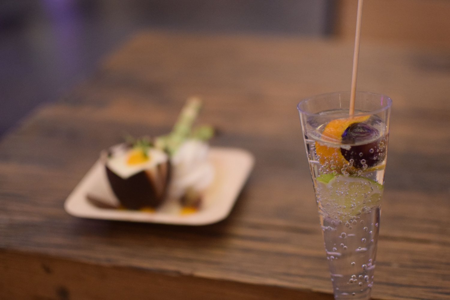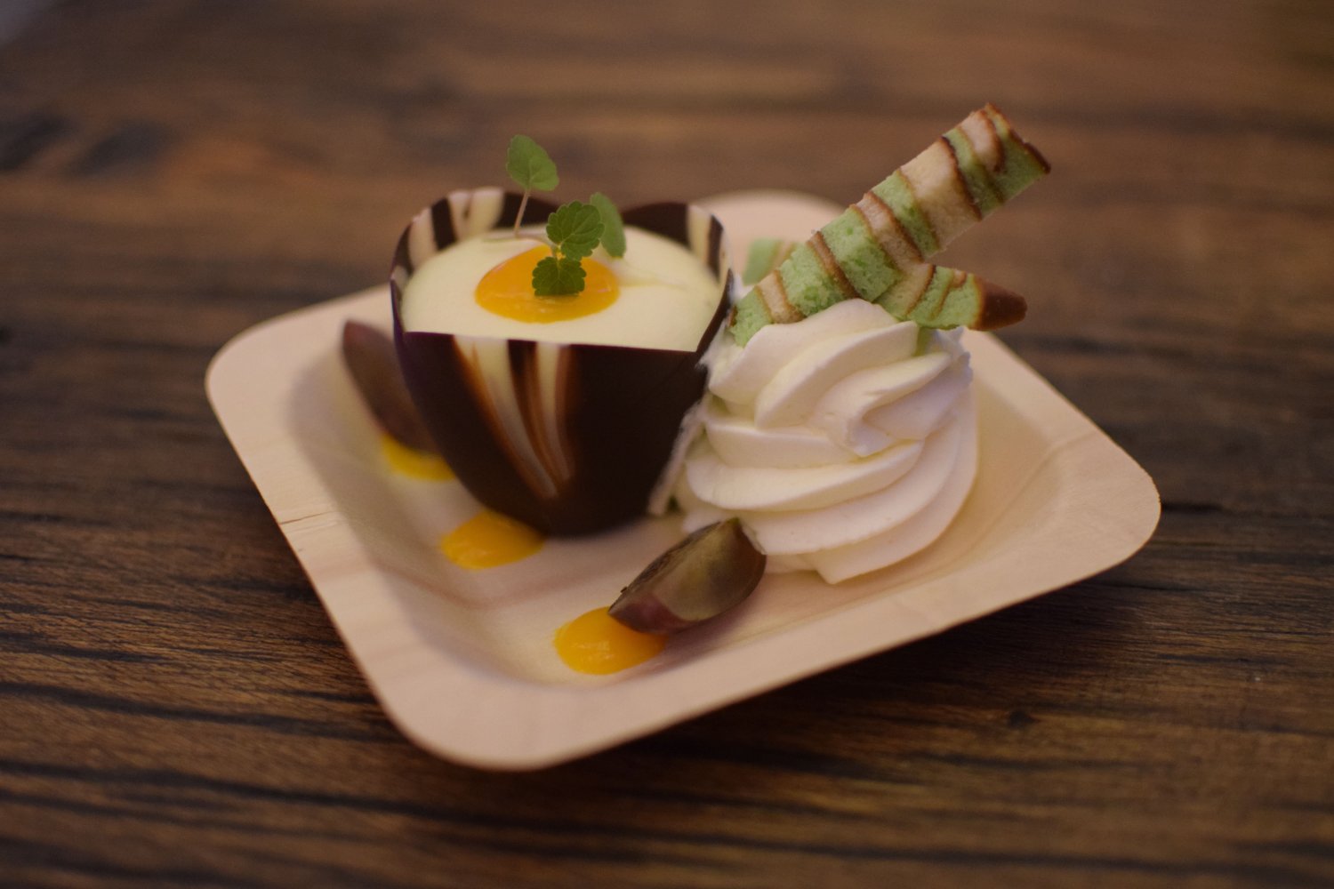 De spritz bestaat uit likeur met 7-up, met daarin een stokje waaraan limoen, een druifje en sinaasappelschil zat. Hierdoor mengde de smaak van het fruit zich met de spritz. De mousse van witte chocolade werd mooi gepresenteerd in een chocoladeroosje, daarnaast lag het toefje slagroom en twee reepjes spekkoek. De druppeltjes mangosaus lagen er mooi naast gedrapeerd. De mousse van witte chocolade was vol van smaak, maar overheerste niet. De mangosaus complementeerde het gerecht zonder teveel zoete tinten in het gerecht te brengen.