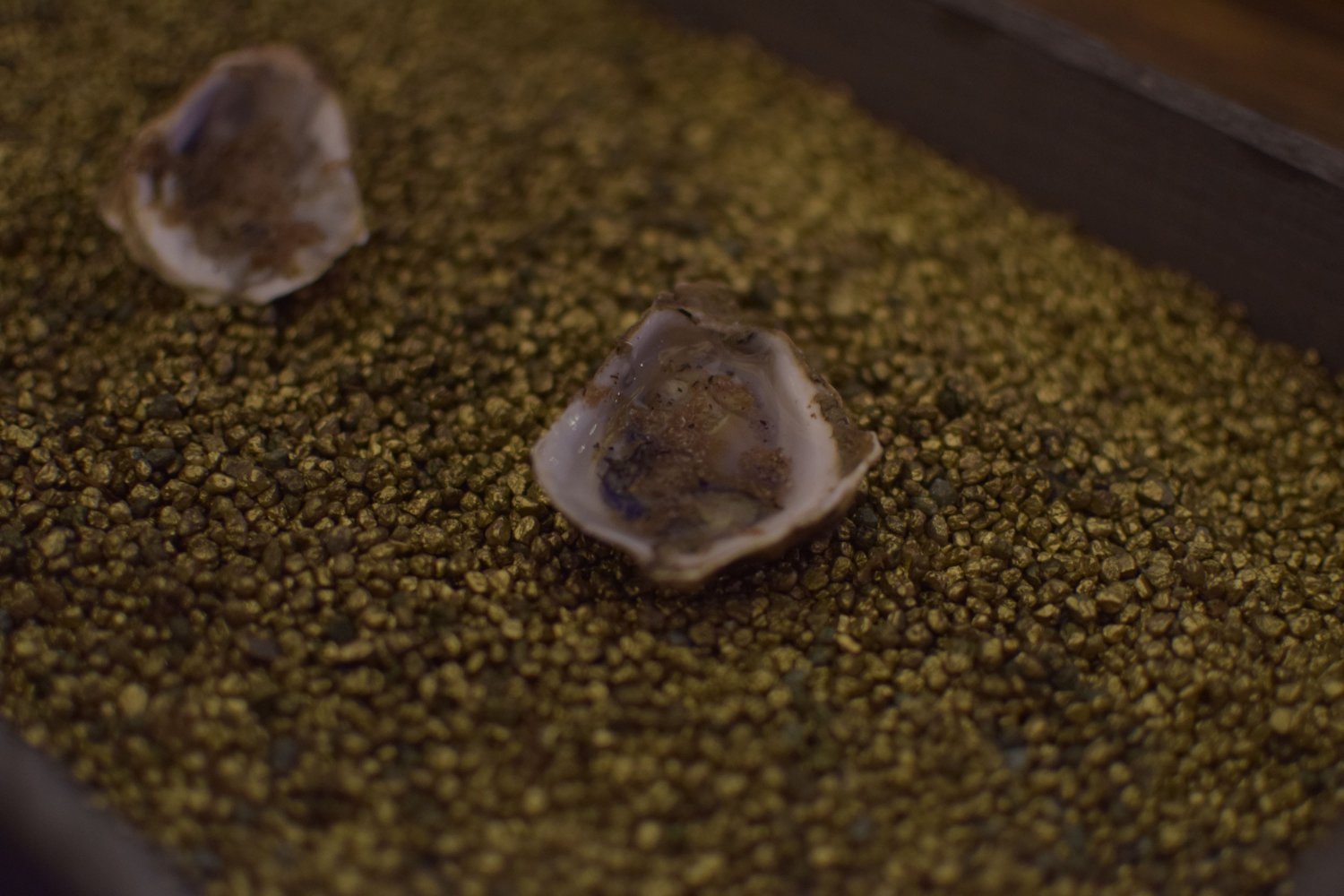 De bijzondere baby oesters uit Normandië werden koninklijk geserveerd op een bedje van gouden steentjes. Hierover ging versgeraspte truffel. De oesters worden geserveerd ter ere van het twee jarig bestaan van By Pascal.