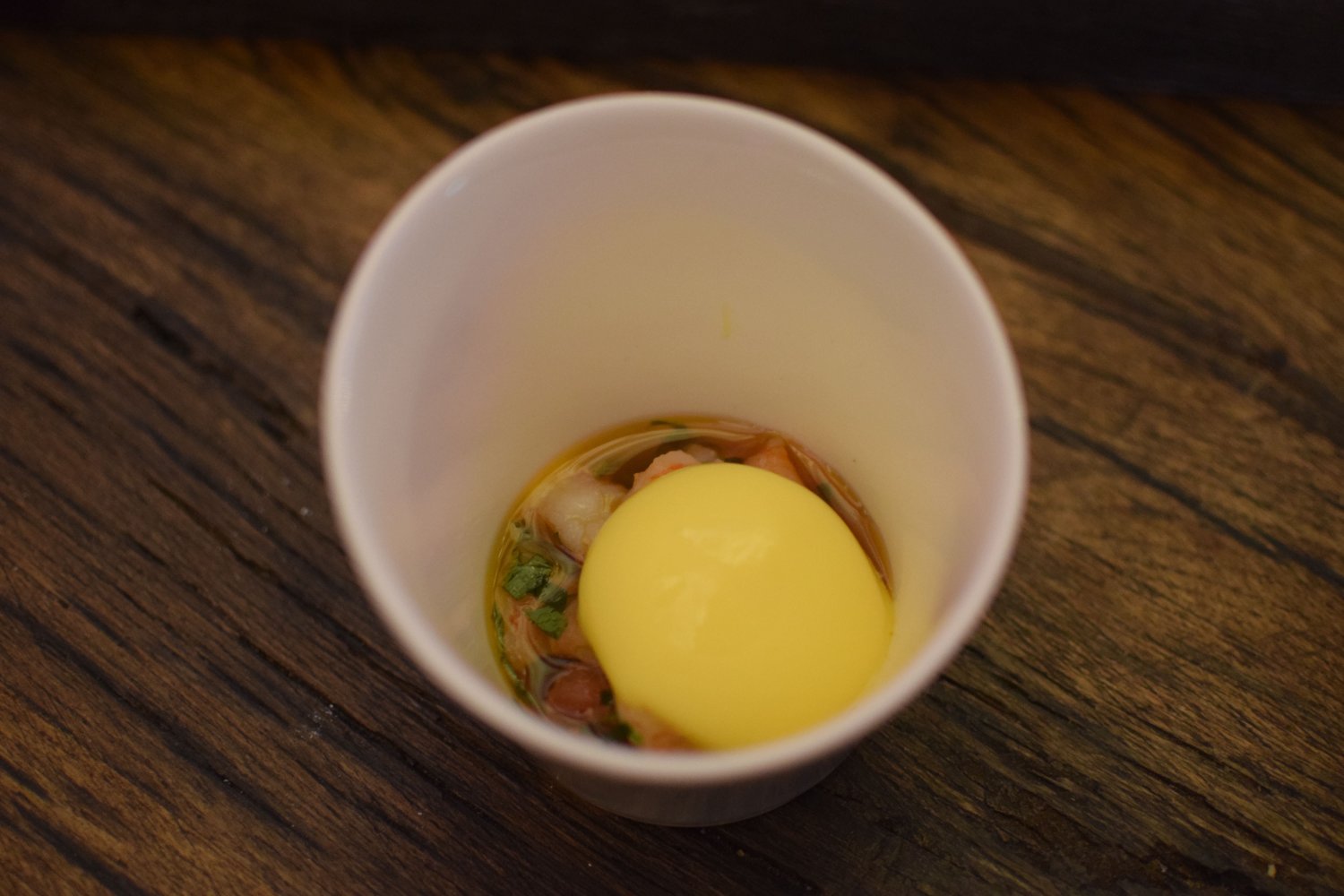 De scampi’s worden gepresenteerd onder een mooie ronde stevige mousse van passievrucht, een bijzondere combinatie die erg goed bij elkaar past. De scampi's zijn zeer langzaam gegaard met onder andere curry en een lichte tint sambal. Het sausje met de curry en de sambal wordt bereid met de karkassen van de scampi's waardoor het een zeer kenmerkende smaak krijgt. Het zuurtje van de passievrucht gaat tevens goed met het kruidige sausje waar de scampi’s in baadde. Ook de koriander komt mooi terug in smaak van het geheel. De scampi’s hadden een zeer mooie garing met een lichte bite.