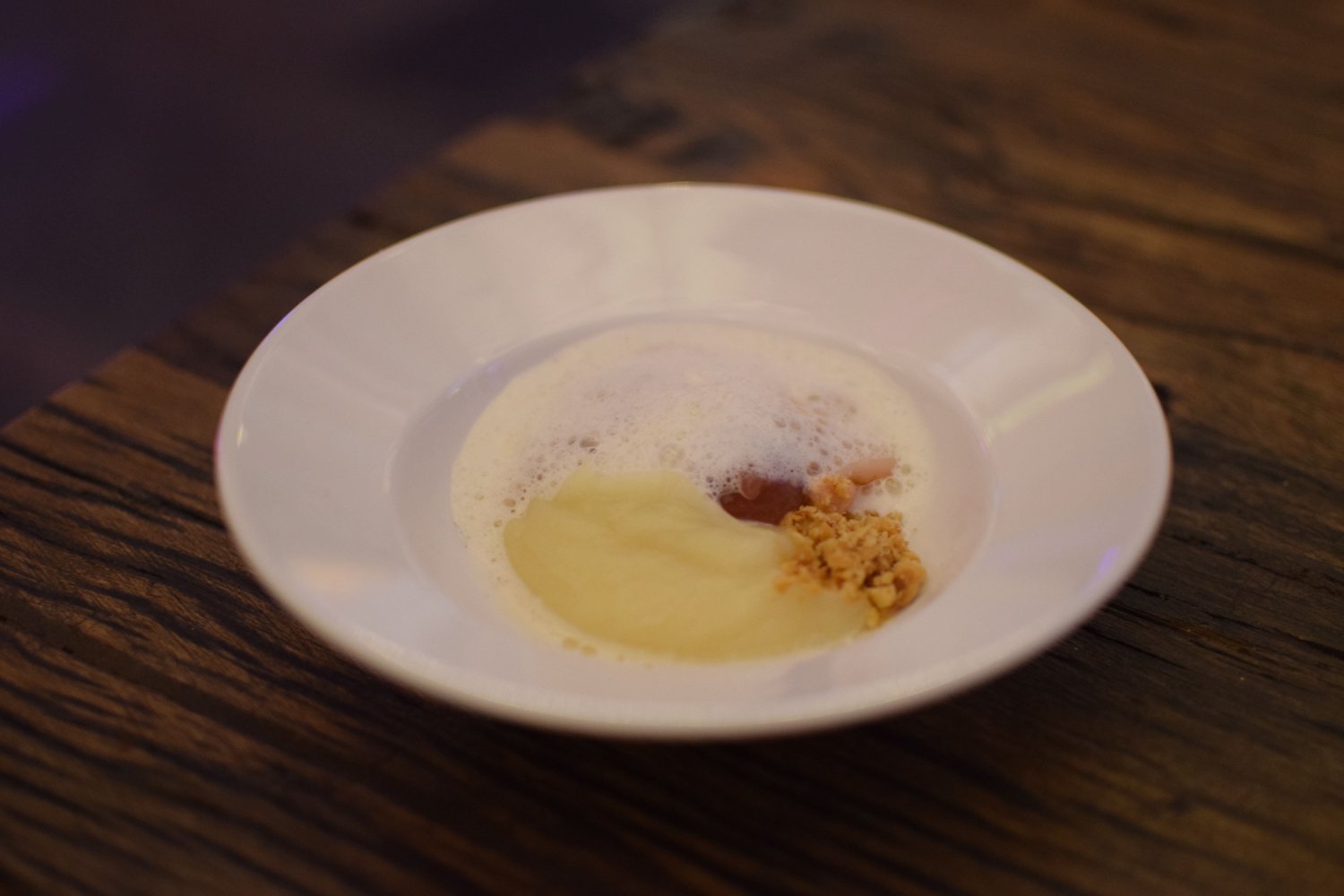 Van dit gerecht wordt iedereen blij. Het buikspek wordt gepresenteerd onder een luchtige saus van kippenvleugeltjes met een confiture van kweepeer. Dit geheel gaat ontzettend goed samen en het vlees smelt haast op je tong. Je hebt nauwelijks een mes nodig om het buikspek aan te snijden. Naast het buikspek ligt een puree van pastinaak, erg zacht van structuur en vol van smaak. Het bietje en de hazelnoot zorgt voor de nodige bite in het gerecht.