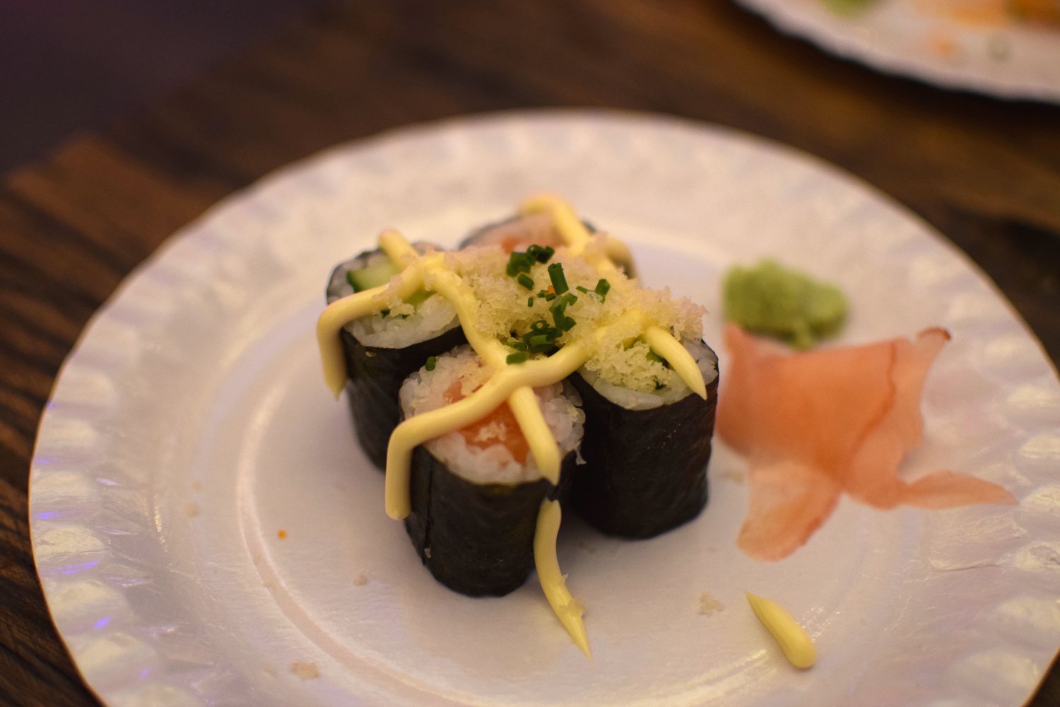 Vier kleine maki’s, twee met knapperige verse komkommer en twee met verse zalm. Simpel, maar toch goed van smaak. Er overheen lag geroosterd sesam en crunchy bits. De Japanse mayonaise vormt een hashtag over het gerecht.