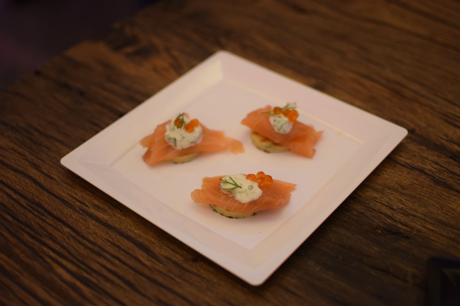 De blini welke erg mooi van structuur was met creme fraiche en zacht gerookte zalm smaakte goed en fris. De zalmeitjes maakte het gerecht wat ziltiger.