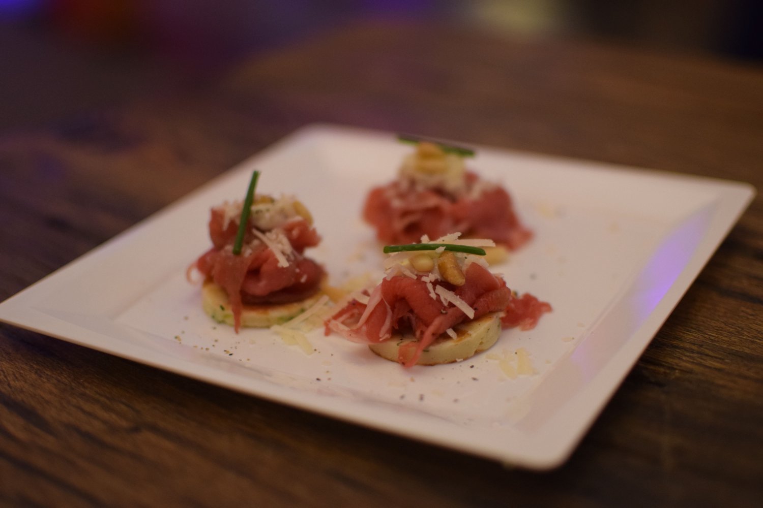 Blini’s met carpaccio van gerookte rib-eye, truffelolie, pijnboompitjes en Parmezaanse kaas