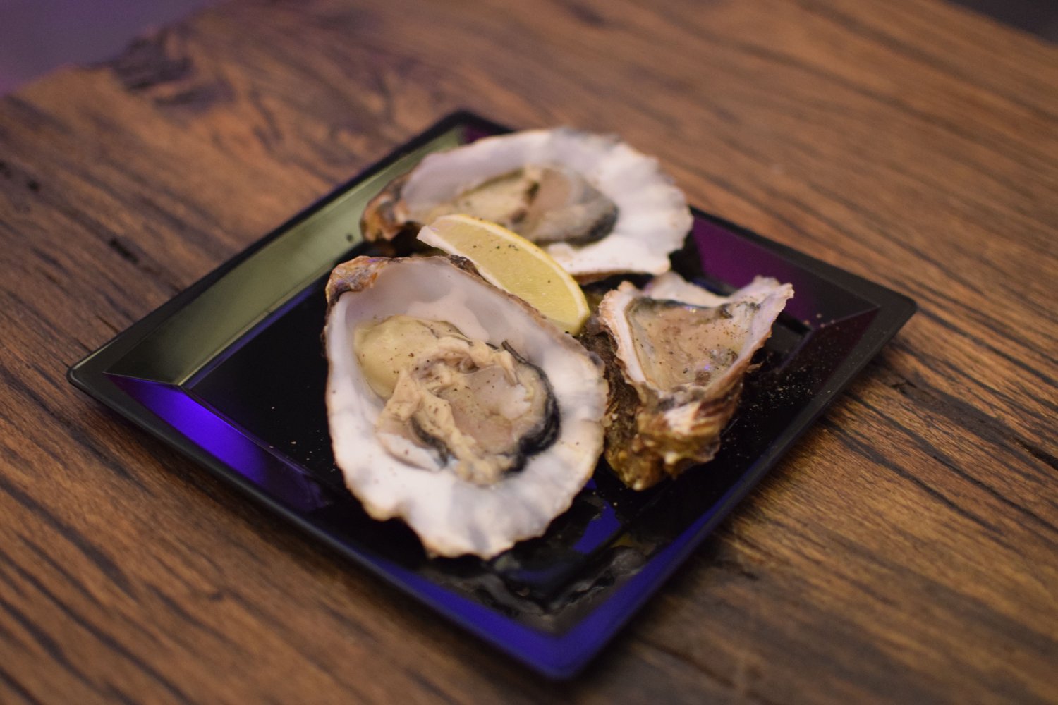 Een mooie grote oester uit de Oosterschelde, de citroen neutraliseerde het ziltige door er een fris tintje aan toe te voegen. Men kan er voor kiezen om een ronde wij vinaigrette toe te voegen.
