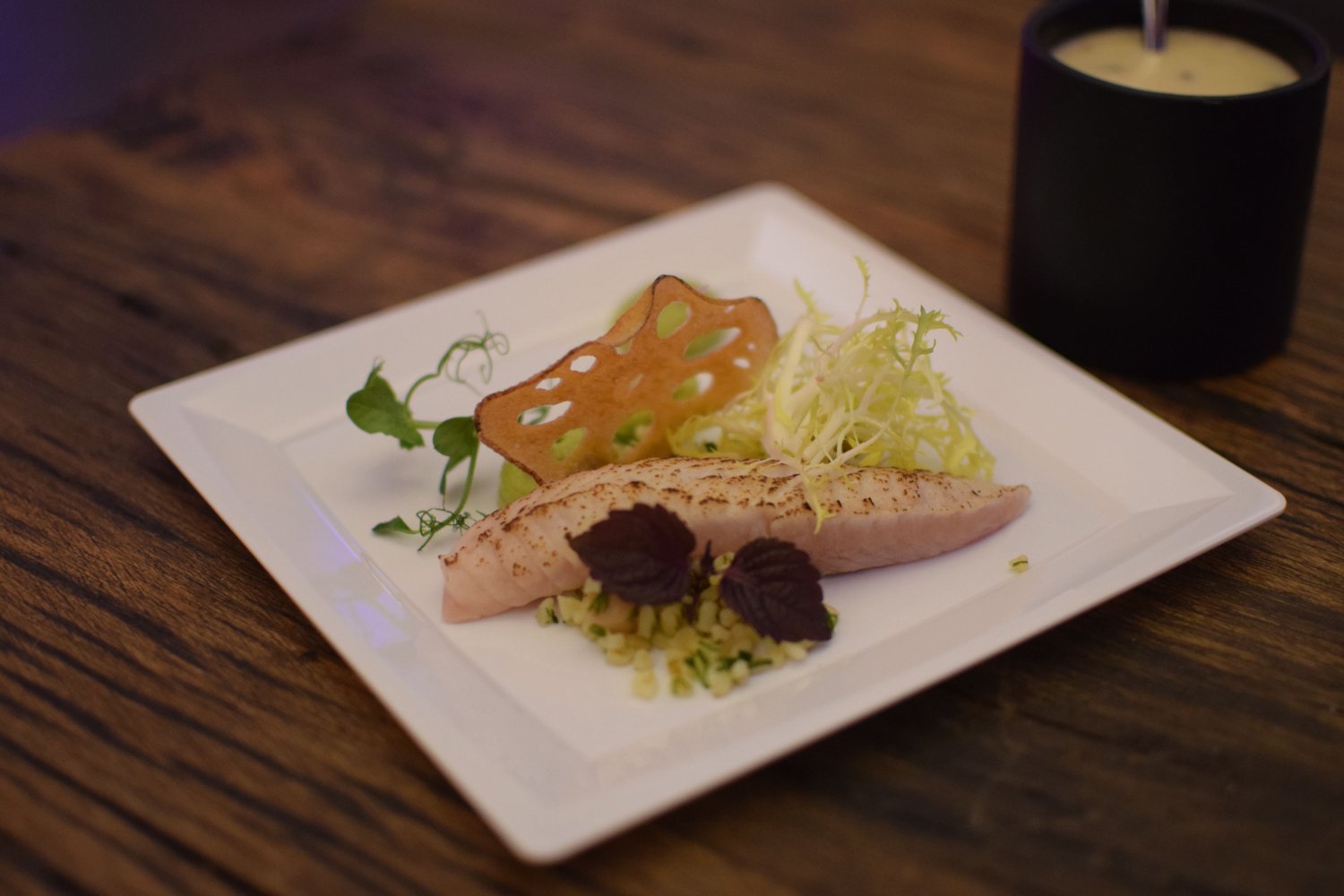 Signature dish: gebrande rode poon, bulgur, avocado crème, chips van lotuswortel