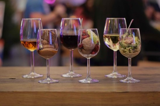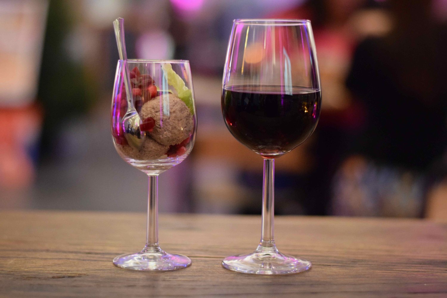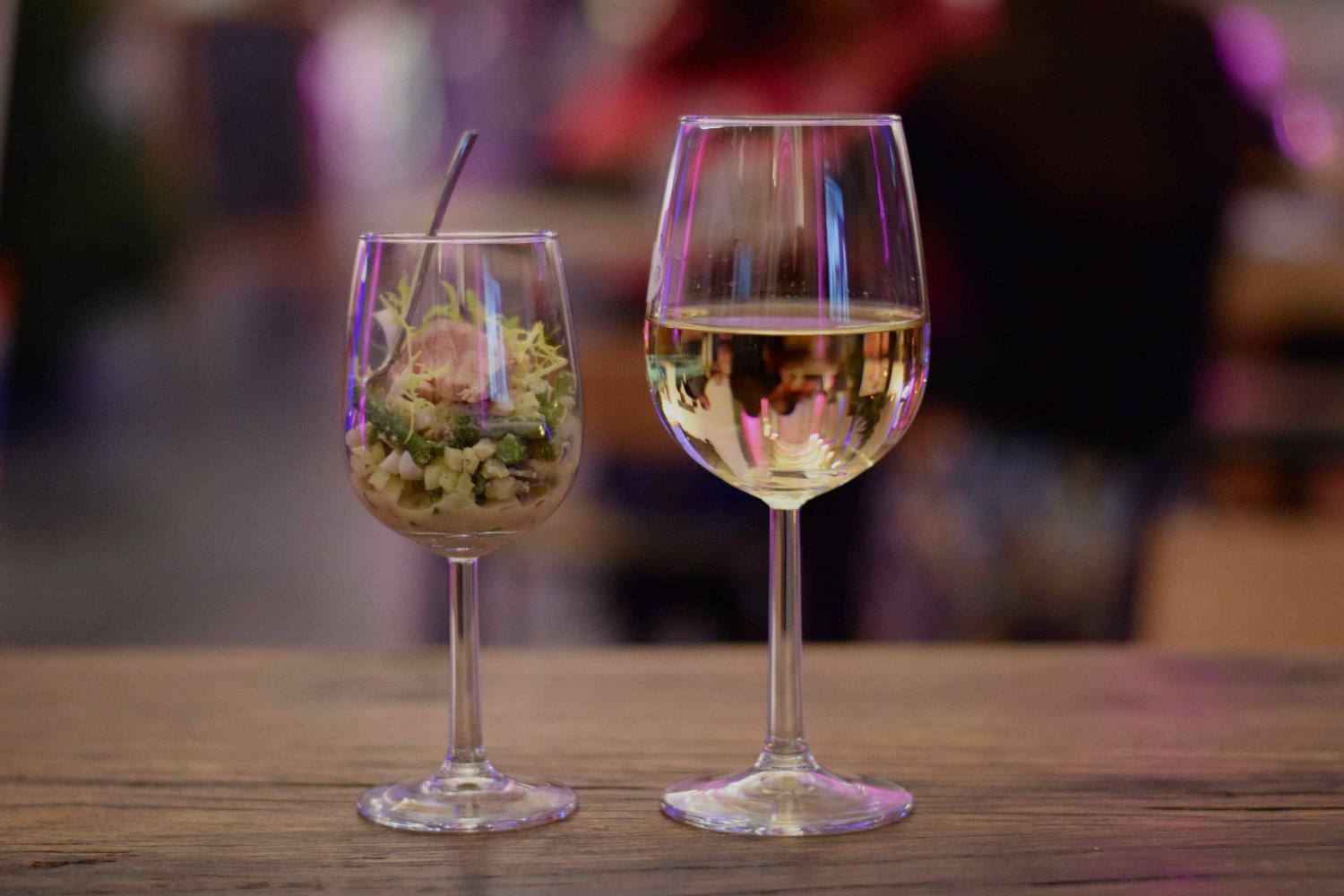 Het eerste bezoek van de avond werd gebracht aan Wijnbar Pinot. Alle gerechten werden in wijnglazen geserveerd, omdat Pinot natuurlijk een wijnbar is. De gerechten die werden geserveerd zijn afgestemd op de verschillende wijnen. Het is mogelijk om uit drie verschillende zeer uiteenlopende wijn/spijs combinaties te kiezen.