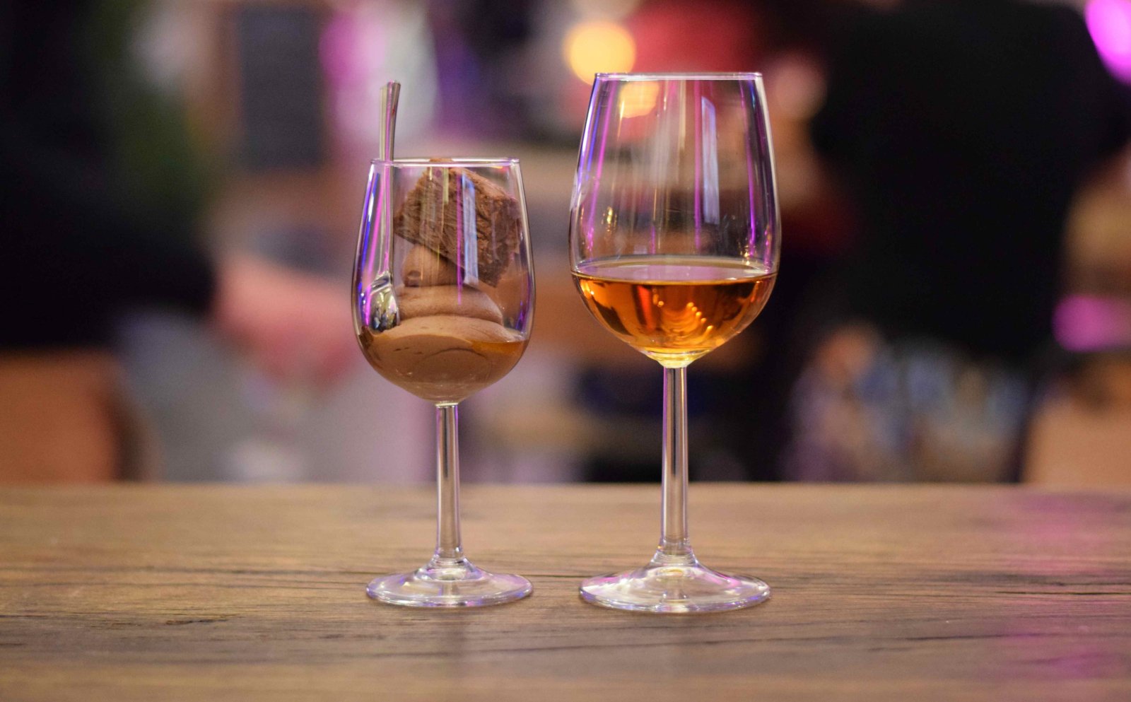 Het derde gerecht is een chocolademousse met brownie. Bij deze zoete lekkernij wordt een Moscatel geschonken. Dit is een zoete dessertwijn die is ingedroogd tot rozijnen en vervolgens versterkt. De wijn heeft een zoete smaak, maar niet zo zoet als een zoete sherry. De chocolademousse is een echte klassieker, gemaakt van slagroom en eieren. De chocolade, die is gebruikt voor de chocolademousse en de brownie, is 60% pure cacao. Als finishing touch is er gebruik gemaakt van karamelsaus. De combinatie van de ingrediënten vormen een geheel en passen goed bij de wijn, een mooie zoete combinatie.
