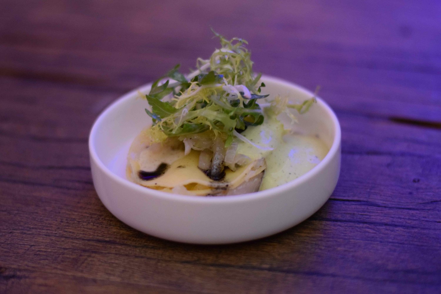 Het eerste gerecht is een salade niçoise met licht dichtgeschroeide tonijn, de tonijn behoudt hierdoor zijn heerlijke natuurlijke smaak. Je proeft echt de heerlijke verse tonijn. De salade wordt in een wijnglas geserveerd, hierdoor zijn de ingrediënten erg goed zichtbaar. De salade is rijkelijk gevuld met harico verts, aardappel, ui, ei. De aardappel zorgt ervoor dat de salade meer body krijgt. De salade is afgemaakt met een dressing van ansjovis, dit maakt de salade tot een geheel. Bij dit gerecht wordt een Albariño wijn geschonken. Dit is een wijn die uit de streek Rias Baixas komt in Spanje. De laatste jaren is dit dé place to be voor witte wijnen. De wijn is fris, licht fruitig en heerlijk zurig. Doordat de dressing van de salade erg licht en romig is, complimenteert dit de wijn erg mooi.