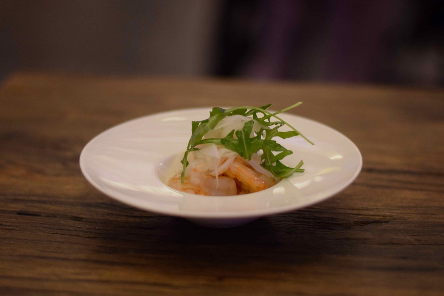 De gebakken gamba’s worden geserveerd op een créme van aardpeer, zoetzuur van rettich en vinaigrette van citrus en masala. Een erg leuk voorgerecht dat goed gebruikt maakt van de rettich en de gamba daarmee een mooie verrassing geeft. Lekker met een mooi wit wijntje.