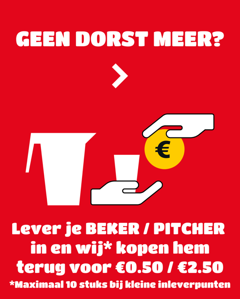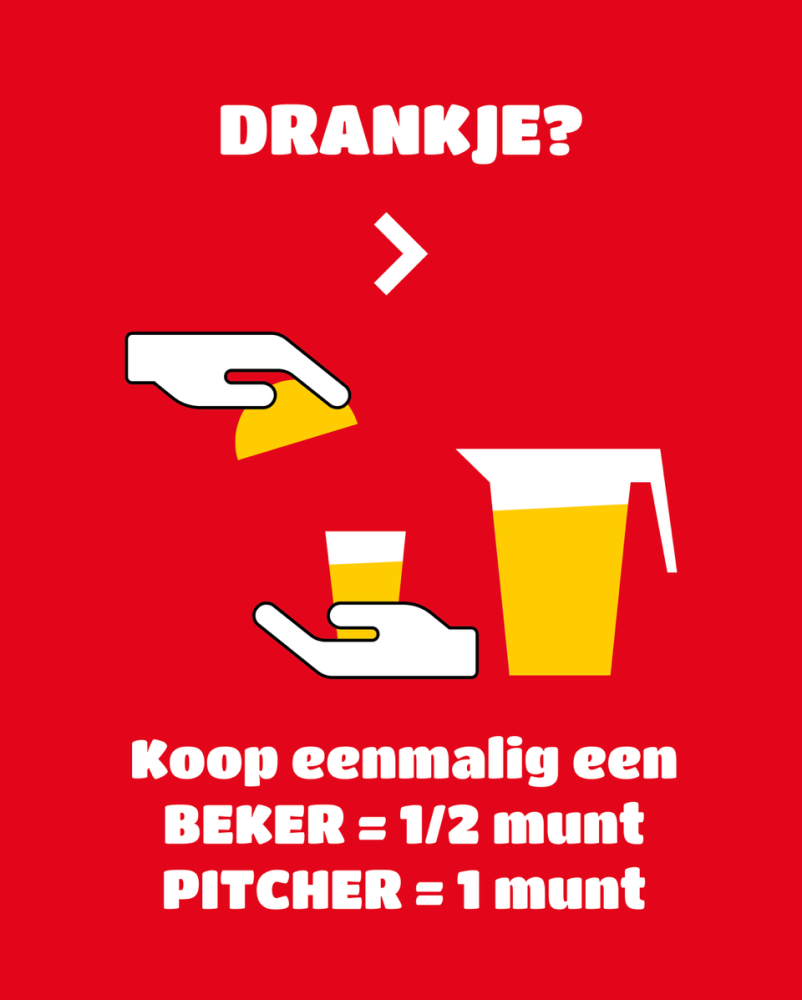 Drankje? Koop eenmalig een beker voor 1/2 munt of een pitcher voor 1 munt. Lever je beker of pitcher in bij het volgende rondje. Heb je geen dorst meer? Dan kun je ze terug inleveren en krijg je €0,50 - €2,50 terug. Heb je meer dan tien bekers? Dan kun je naar het grote inleverpunt bij de Graanbeurs of Valkenbergpark.