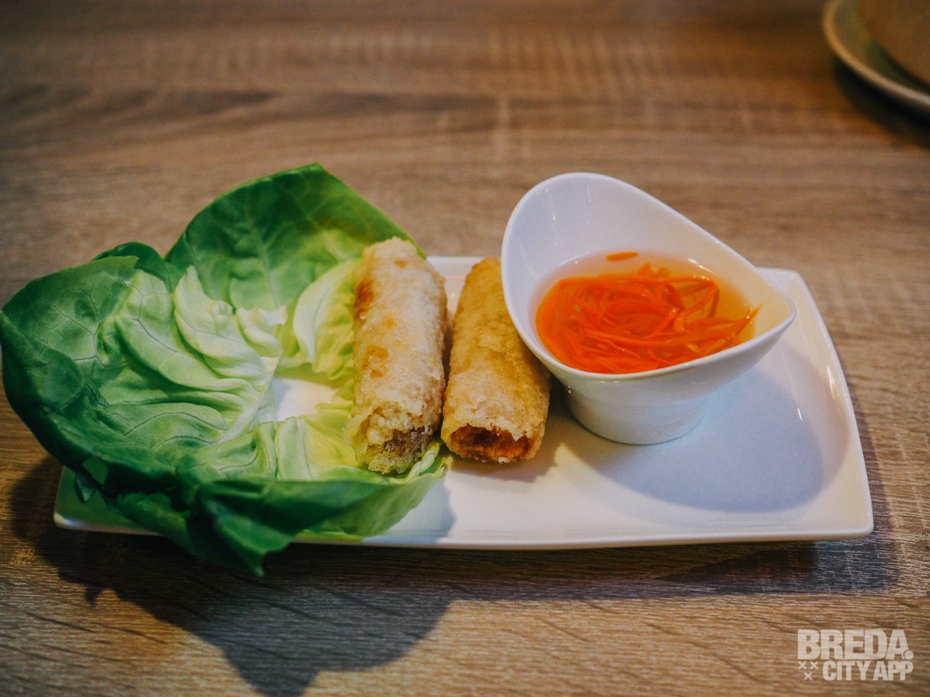 Nadat we de drankjes uitgebreid hebben getest, kijken we naar de voorgerechten. Er staan verschillende Vietnamese snacks op de kaart, zoals loempia's, lenterollen en viskoekjes. Bij Vietnamees eten gaat het om de balans tussen verschillende smaken. Dit wordt gerealiseerd met verse ingrediënten. Wij gaan voor de Cha Gio en Goi Cuon. Cha Gio is een klassieke Vietnamese loempia met garnaal, krab of groenten. Wij kiezen voor garnaal. De garnaal is fijngesneden verwerkt in de loempia. De loempia rol je in een blaadje sla en vervolgens dip je hem in een sausje. De Cha Gio is behalve met garnaal nog gevuld met de juiste hoeveelheid vermicelli en goed op smaak gebracht met kruiden.