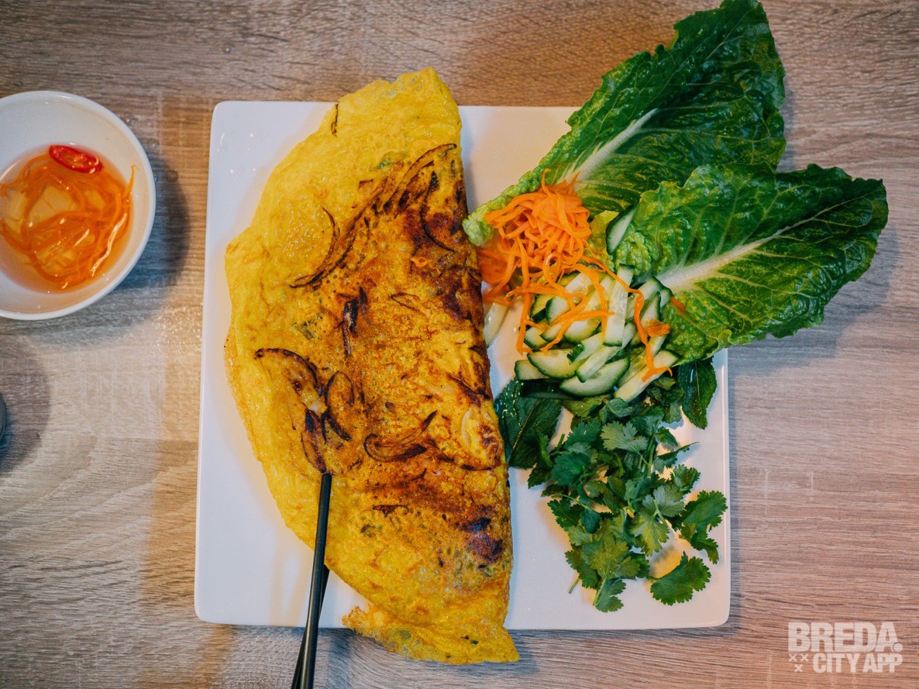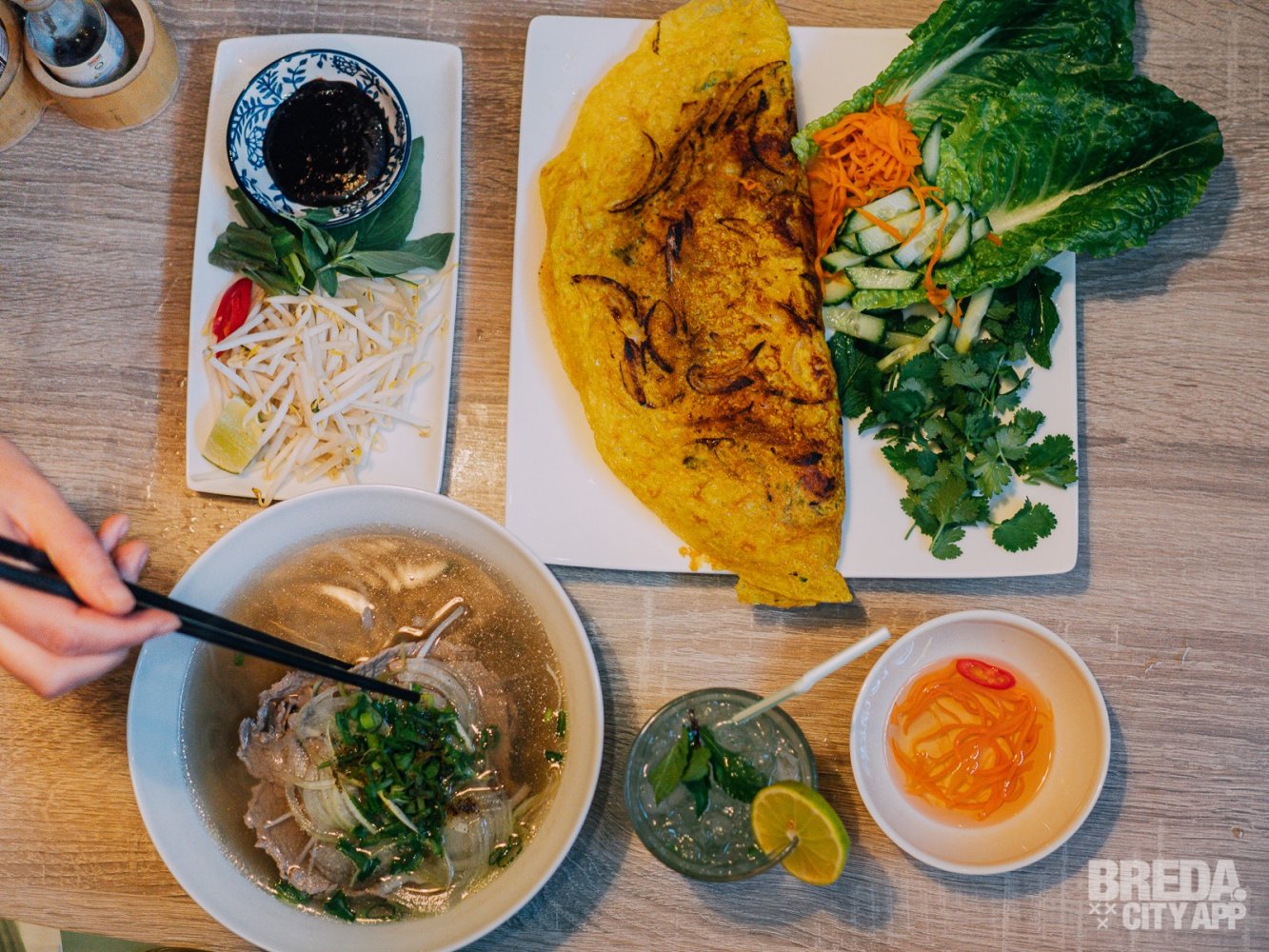 Dat de koks van dit restaurant uit Vietnam komen, proef je terug in alle gerechten. Dit is  de lekkerste Pho die we tot nu toe ooit gegeten hebben! Ons andere hoofdgerecht - Bahn Xeo - is een knapperige pannenkoek die goed is gevuld met gebakken garnalen en groenten. De pannenkoek is lekker knapperig en kruidig van binnen.