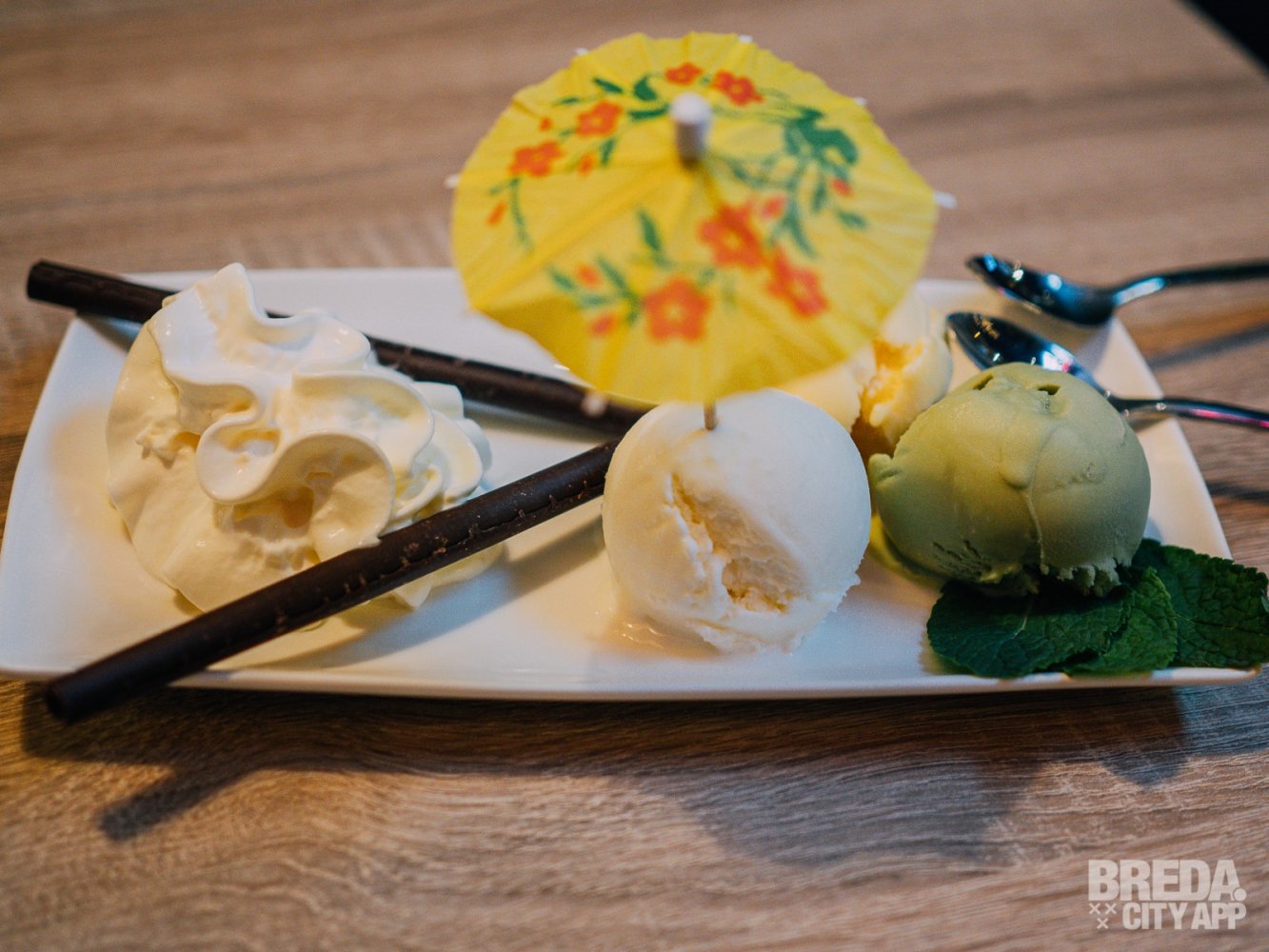 De desserts bij Enjoy Vietnam wisselen regelmatig. Deze keer serveren ze drie bolletjes ijs in de smaken passievrucht, kokos en groene thee. Deze drie ijssmaken zorgen voor een ware smaakexplosie. De passievrucht heeft een zuurtje, de kokos is zoet en de groene thee heeft een licht bittere nasmaak.