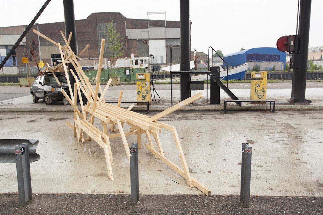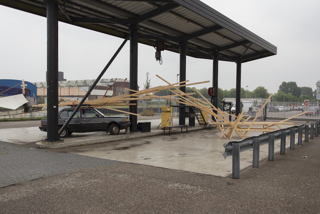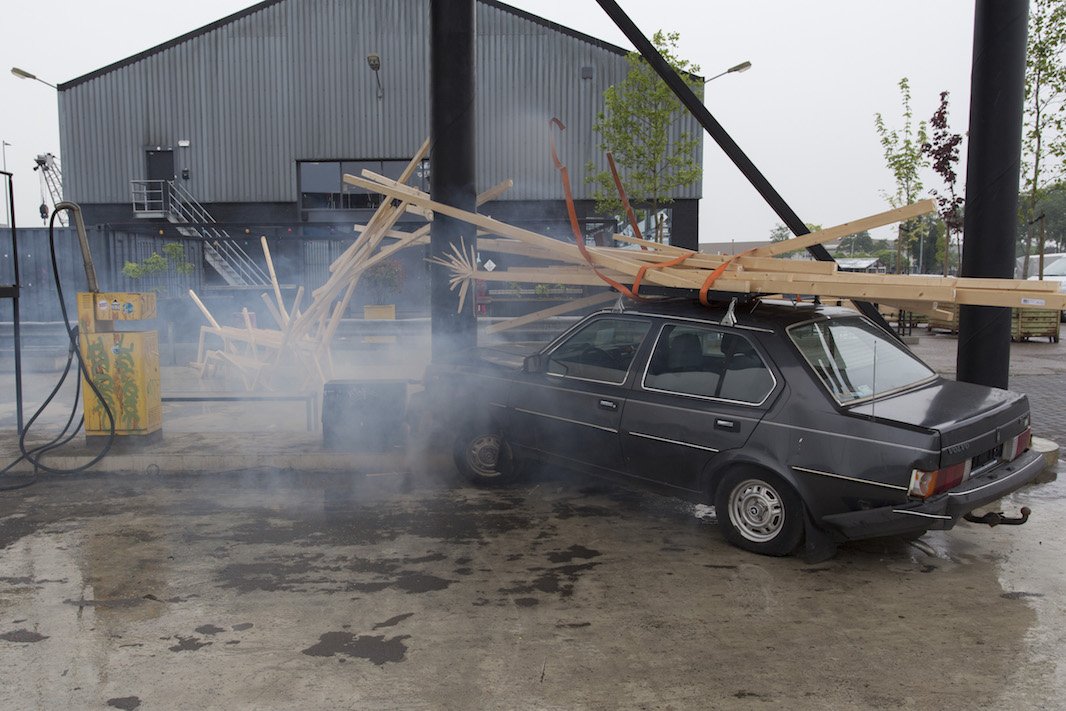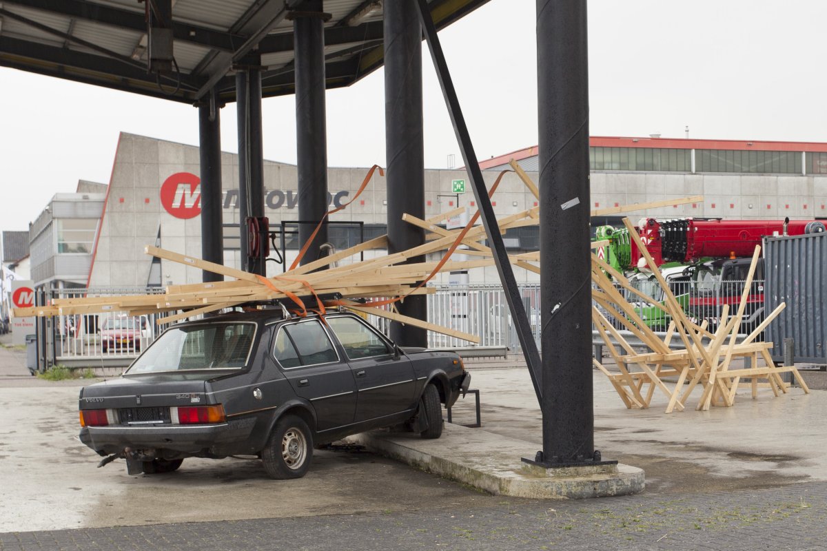 Veel verbaasde blikken bij skatepark Pier15. Sinds 28 mei staat er een gecrashte auto waar een houtstellage aan vast zit voor de deur. Voor het project Under Construction van Bredase kunstinstelling KOP werd kunstenaar Leonard van Munster namelijk gevraagd om aan de slag te gaan met een onbestemd gebied in Breda. Zijn oog viel op de Veilingkade, waar op dit moment veel aan de hand is. Leonards werk gaat over een klusser die gestrest naar zijn werk rijdt met houten balken op zijn dak. Omdat hij zo'n haast heeft knalt hij tegen een benzinepomp aan en schuiven de balken van het dak in de vorm van de picknicktafel die hij wilde maken. Een geluk bij een ongeluk. Het werk is nog te bewonderen tot 26 juni.