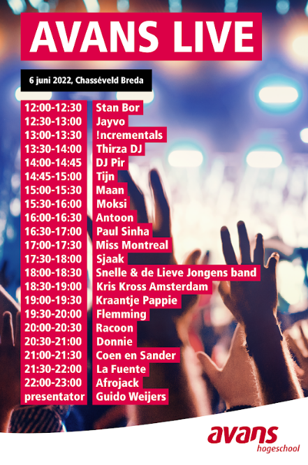 Op Tweede Pinksterdag (maandag 6 juni) kun je van 12:00 tot 23:00 uur losgaan op de muziek van bekende dj’s en verschillende topartiesten tijdens Avans Live op het Chasséveld in Breda.