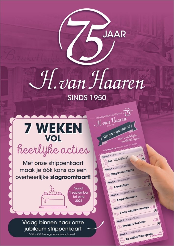 In september is het feest aan de Veemarktstraat 27 in Breda: Banketbakkerij-Tearoom H. van Haaren bestaat 75 jaar! Al driekwart eeuw weten Bredanaars en bezoekers de weg te vinden naar deze heerlijke plek voor vers gebak, knapperige koekjes, feestelijke taarten en natuurlijk een gezellig kopje koffie. En dat bijzondere jubileum vieren ze met iedereen mee!