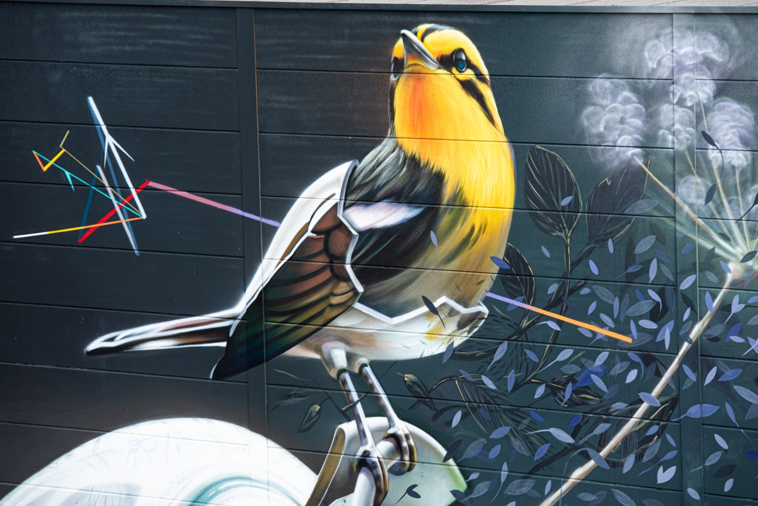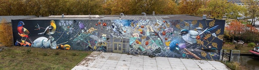 De keuze voor vogels als symbool is een logische: het zijn kwetsbare, tegelijk krachtige diersoorten. Trots en kleurrijk. Of juist subtiel en onopvallend, zich schikkend naar hun omgeving. Sommige elementen, als de gebroken vaas, herbergen symbolische verhalen die alleen de kunstenaars en sommige bewoners kennen. Tussen de vogels ontspruiten kruiden, bloemen, bessen en planten van ‘wilde grond’. Vanwege de semi-lockdown moest ook Electron gesloten blijven voor publiek, maar ze hopen iedereen in december weer te kunnen verwelkomen in goede gezondheid.