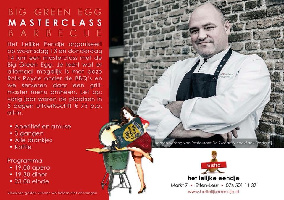 Het Lelijke eendje organiseert een masterclass barbecue bij restaurant de Zwaan in Etten-Leur op 13 en 14 juni. De Big Green Egg van de Kookzaak wordt hier gedemonstreerd. Je leert wat er allemaal mogelijk is met deze Rolls Royce onder de BBQ's en er wordt een grill-master menu geserveerd.
