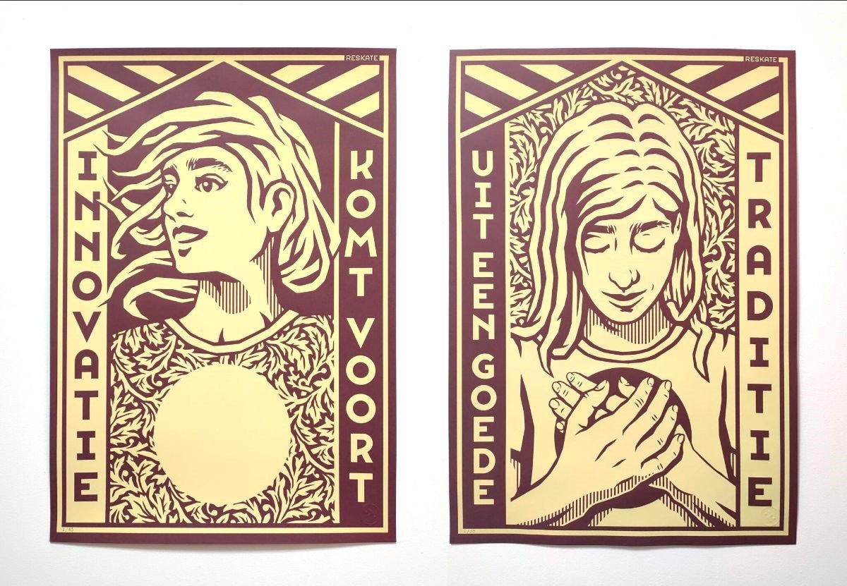 In de Blind Walls Gallery Gallery tonen we regelmatig nieuw werk van kunstenaars die eerder een muurschildering maakten in Breda. Deze keer is dat werk van Reskate! Vorig jaar maakten zij een Blind Wall aan het Planciusplein en de Columbusstraat. Hier lieten ze zich inspireren door het typerende gedachtegoed van architecten Molière en Peutz. Gekeken naar de twee architecten en hun waarden, leidde dit tot de alomvattende spreuk: 'Innovatie komt voort uit een goede traditie'. Een zeer gelimiteerde oplage zeefdrukken hiervan komt weer terug in deze expo.