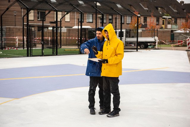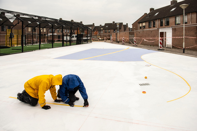 Ruim 700 liter verf. Twee weken schilderen. Dat is er voor nodig om het plein om te toveren tot een kunstwerk. Andrea en Marco zijn zeer bedreven met het beschilderen van grote oppervlakten; eerder schilderden ze al in verschillende wereldsteden basketbal courts en skatebanen in hun eigenzinnige stijl.