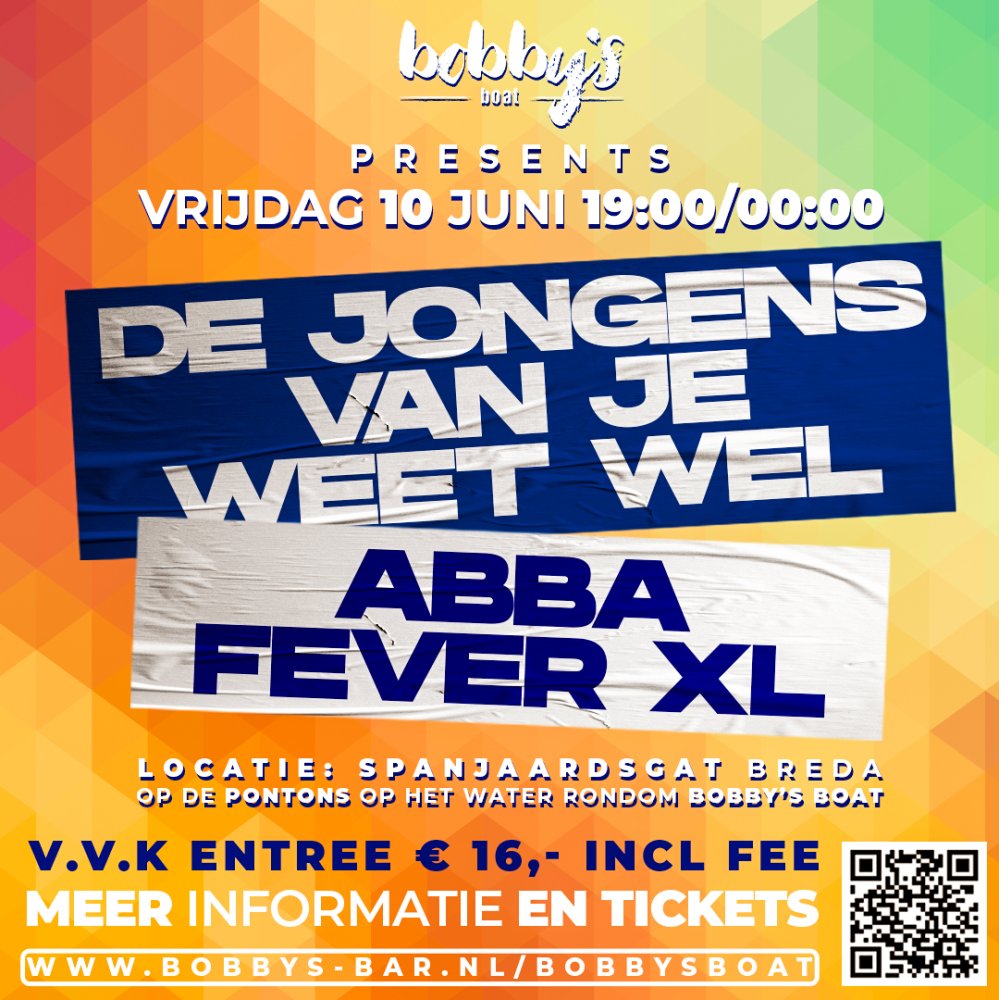Op vrijdag 10 juni 2022 brengt Bobby’s Boat twee top acts naar het Spanjaardsgat op de pontons rondom Bobby’s Boat. Bezoekers kunnen genieten op een avond op een unieke locatie op het water in het centrum van Breda met de grootste hits door De Grote Jongens van Je Weet Wel en ABBA Fever XL. Tickets zijn verkrijgbaar op www.bobbys-bar.nl/bobbysboat voor €16,- incl. fee.