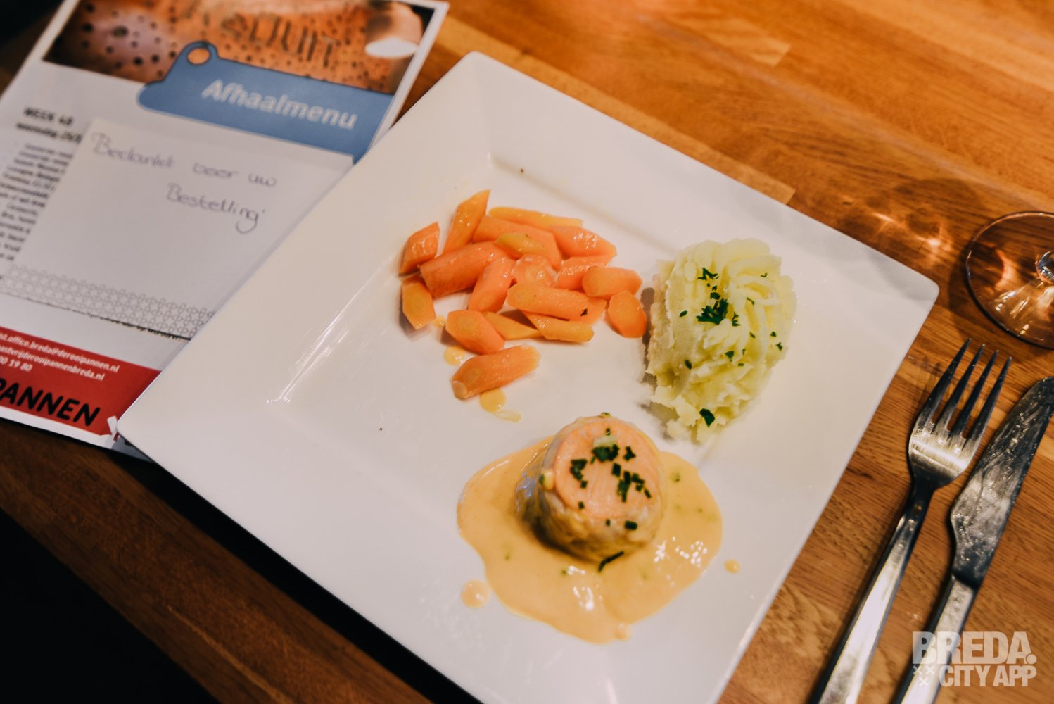 Voor het hoofdgerecht kunnen we kiezen uit zalmrolletjes met geglaceerde worteltjes en aardappelpuree of een zuurkoolstamppot met gehaktbal in de jus.