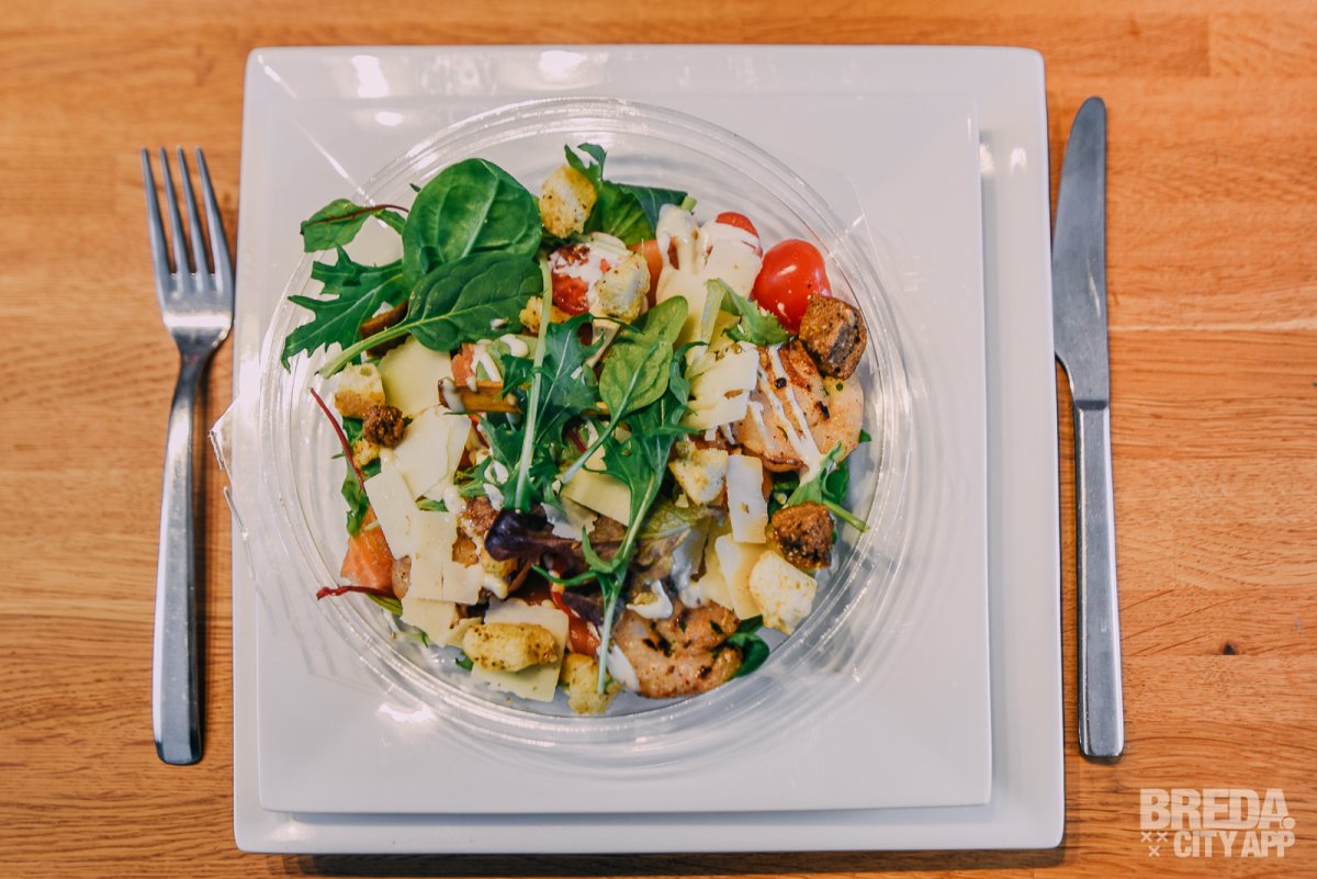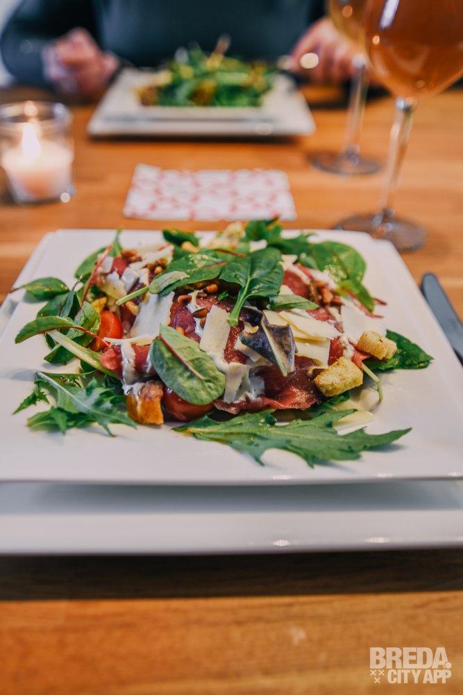 De hoofdgerechten kunnen later opgewarmd worden. We beginnen met de salades. Dit is een lekker voorgerecht! We hebben twee verschillende salades, dus die gaan we lekker delen. Een salade is met carpaccio en de andere met vis. Beide salades zijn heerlijk vers en goed op smaak gebracht met een dressing van truffelmayonaise. Naast knapperige sla zitten er tomaatjes, croutons, Parmezaanse kaas en pijnboompitjes in. In de vissalade zitten ook garnalen en is goed gevuld.