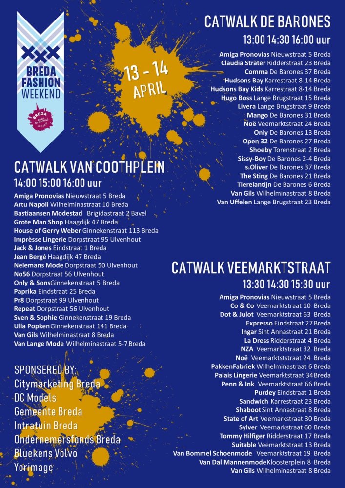 Maar liefst 60 deelnemende mode- en mode-gerelateerde zaken uit de binnenstad van Breda, Ulvenhout en Bavel zullen hun collecties showen. Als de ene show gereed is, is er ruim de tijd om door te lopen om niets te missen van de volgende show op een van de andere locaties. De showtijden zijn hier namelijk volledig op afgestemd. De route die men dan loopt gaat van de Barones naar de Veemarktstraat en eindigt op het Van Coothplein waar men op de uitgebreide terrassen plaats kan nemen.