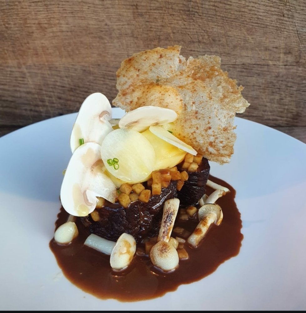 De eigenaren van Dok 19 Breda & Dok 18 Breda hebben onlangs de Kleine Wereld overgenomen en toveren dit om tot een nieuw concept! Bij DKW maken ze voor jou een gelakte rundersukade, met crème & krokant van aardappel, akkerzwam, koolrabi en jus van tijm.