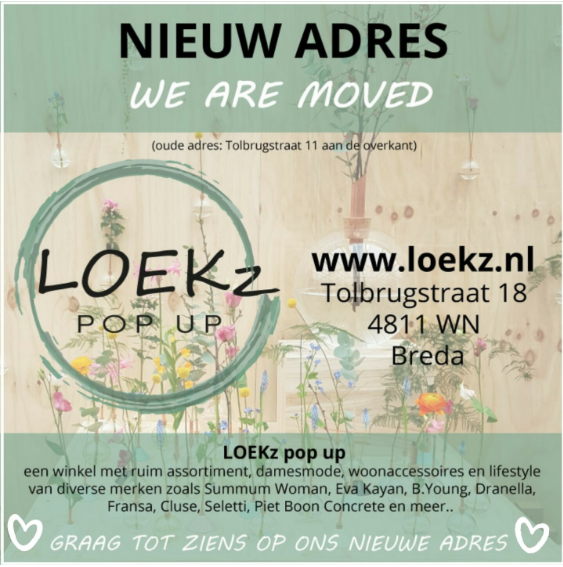 LOEKz Concept Store is 1 mei naar de overkant verhuisd; van de Tolbrugstraat nummer 11 naar nummer 18. LOEKz is een conceptstore vol accessoires, cadeauartikelen, damesmode, lifstyle- en woonartikelen en verkoopt merken zoals SUMMUM, SRNDPTY, Eva Kayan, Dranella, B.Young, Fransa en Osi Femmes. Maar ook Cluse, Marc Inbane, AZone, Seletti, Plumen, Piet Boon en Magnet Wallpaper.