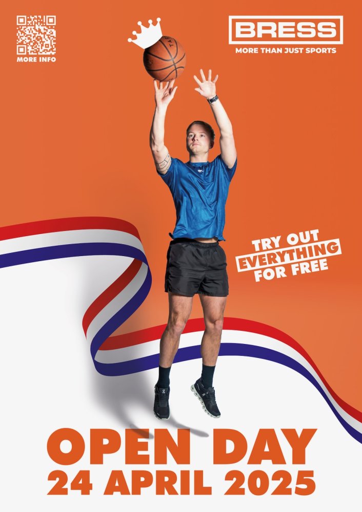 Op donderdag 24 april zet BRESS haar deuren wagenwijd open voor een feestelijke en sportieve middag en avond tijdens Open (King’s) Day – een speciale Koningsdag-editie van de BRESS open dag. Van 16:00 tot 21:00 is iedereen welkom om gratis mee te doen aan allerlei sportieve, oranje gekleurde activiteiten in typisch BRESS-stijl: actief, gezellig en met een dikke knipoog naar de Koningsspelen. ππ