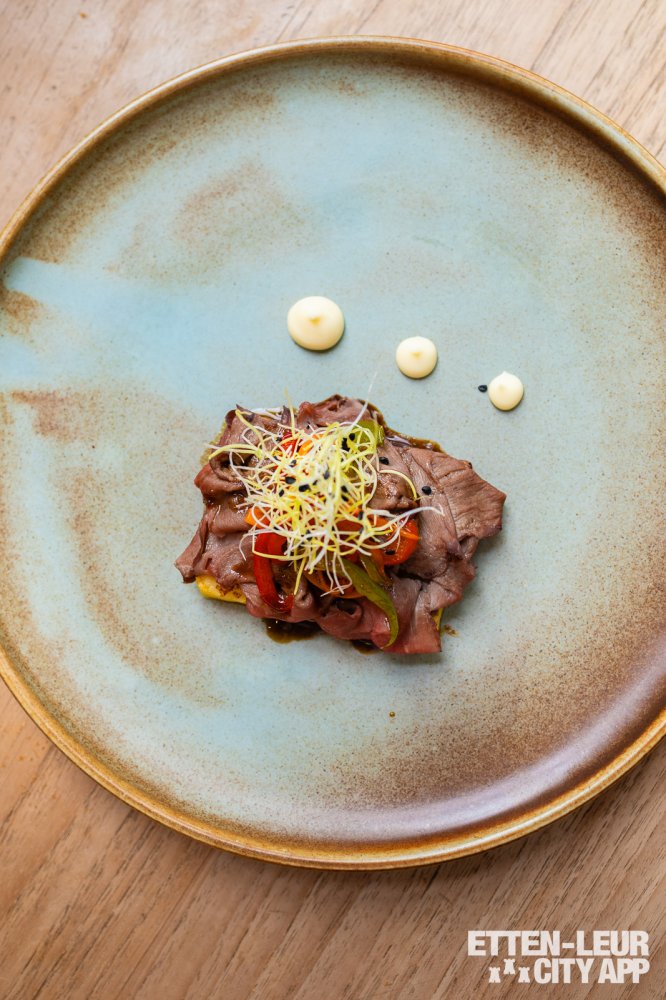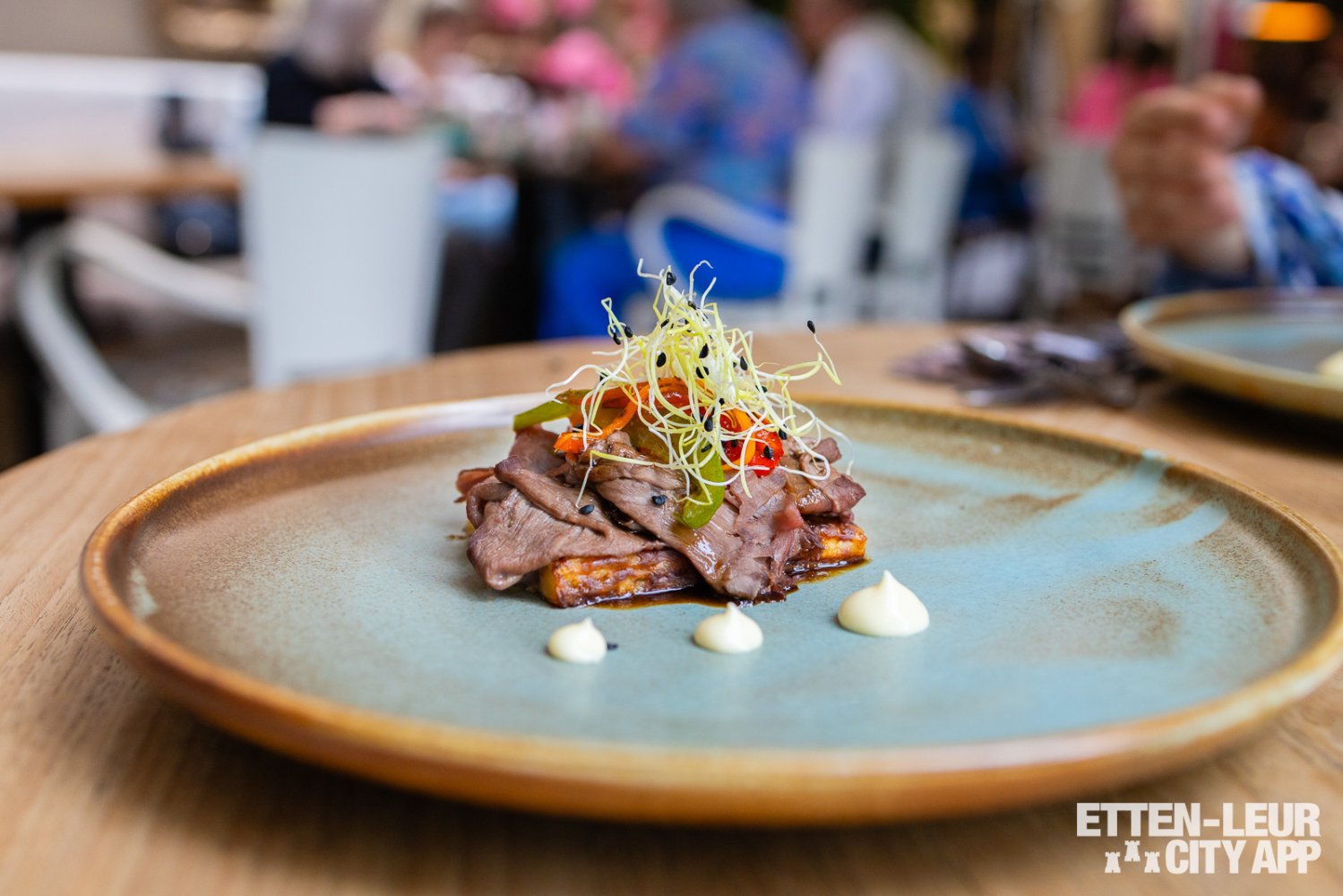 De tweede warme gang van onze brunch wordt geserveerd, een mooi gerecht met zachte aardappelpuree, royaal bedekt met warme rosbief en geroosterde paprika. Omdat de rosbief gebraden is, geeft dit een heerlijke smaak aan de dunne stukjes vlees die het gerecht bedekken. De geroosterde paprika past goed met zijn smaak bij de zachte aardappelpuree.
