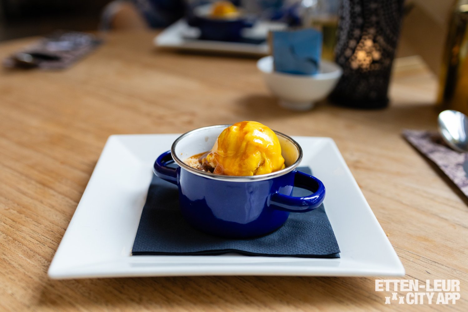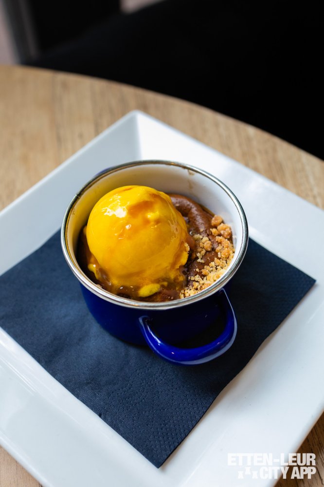 Om deze drie gangen brunch af te toppen met een perfecte laatste gang, krijgen wij de karamel cheesecake met een bol mango ijs geserveerd. Dit geweldige 'dessert' maakt van onze heerlijke brunch een zalige middag vol genot en verwennerij!