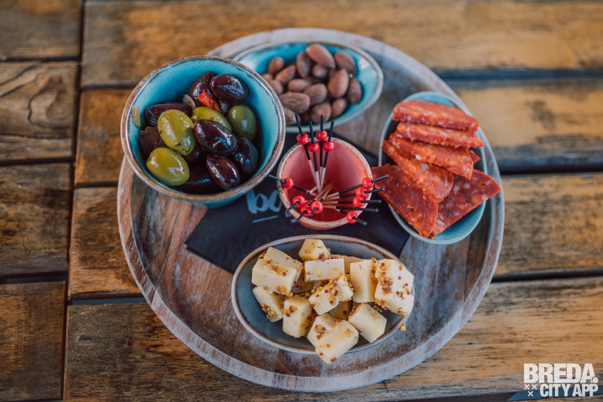 Bij een drankje hoort een hapje en daarom kiezen we een borrelplateau om te delen. Het borrelplateau bestaat uit mosterdkaas, chorizo, olijven en amandelen. Ideaal om af en toe wat te snacken, maar niet te overheersend naast de heerlijke cocktail en gin-tonic. Een super combinatie naast de drankjes wat ons betreft.