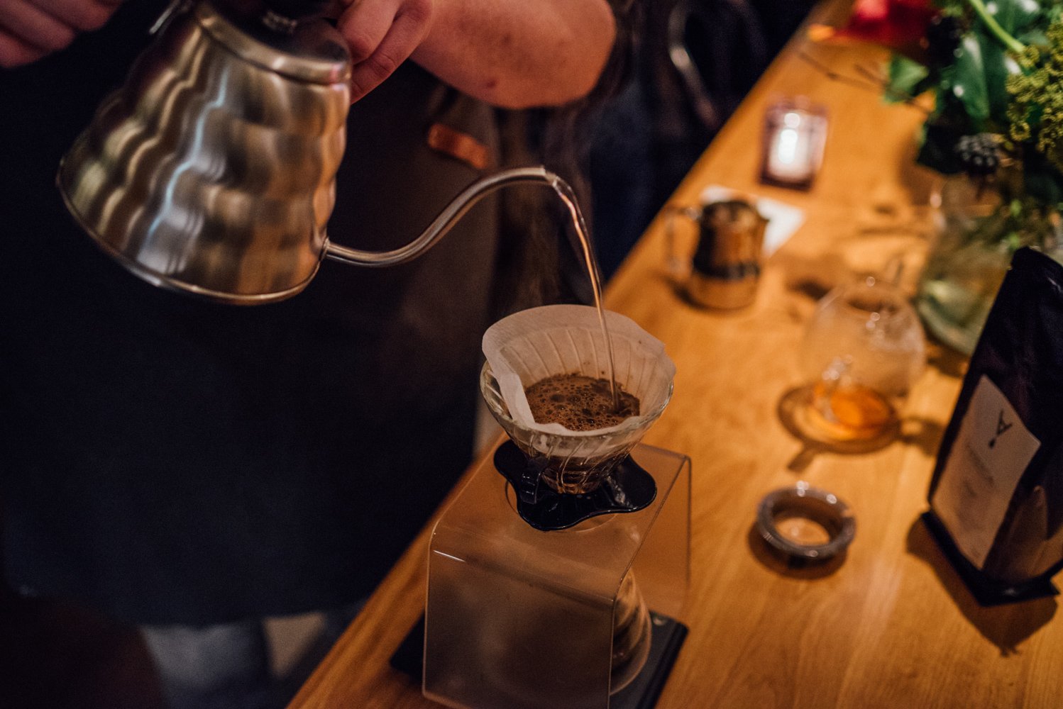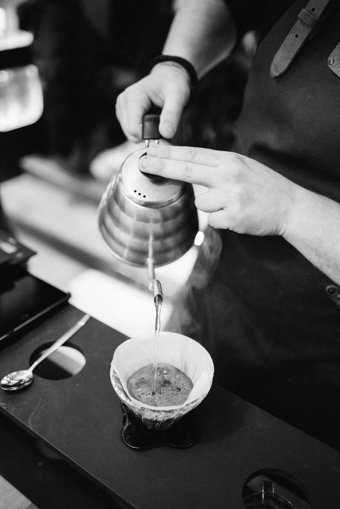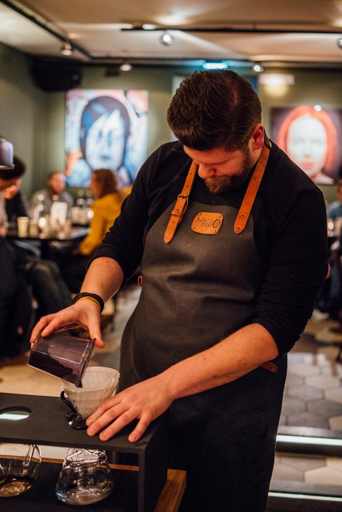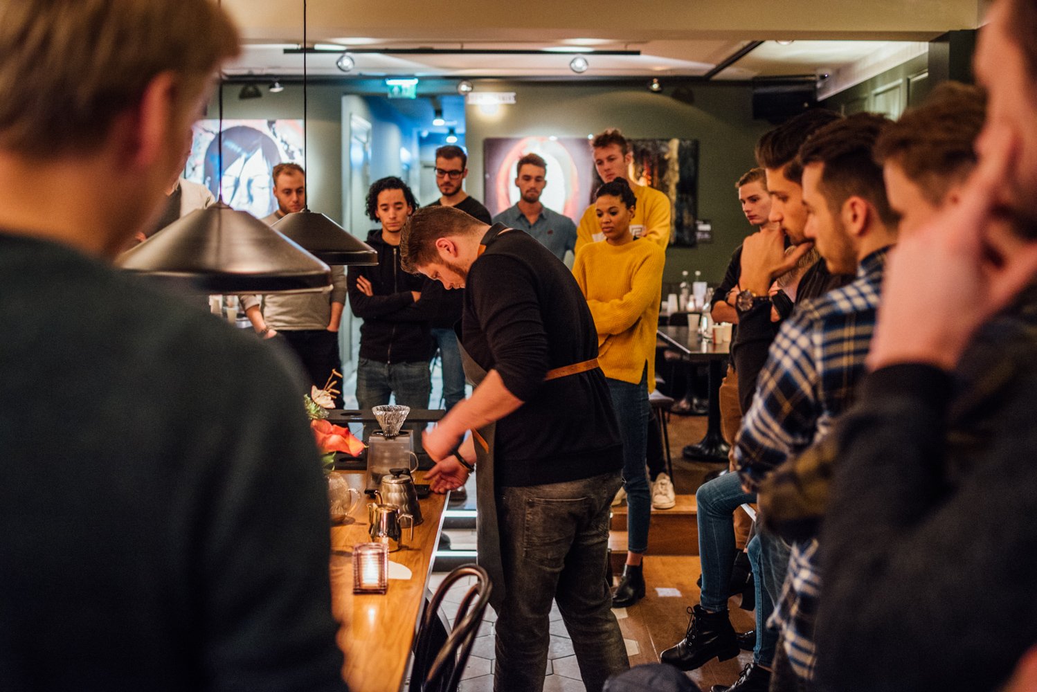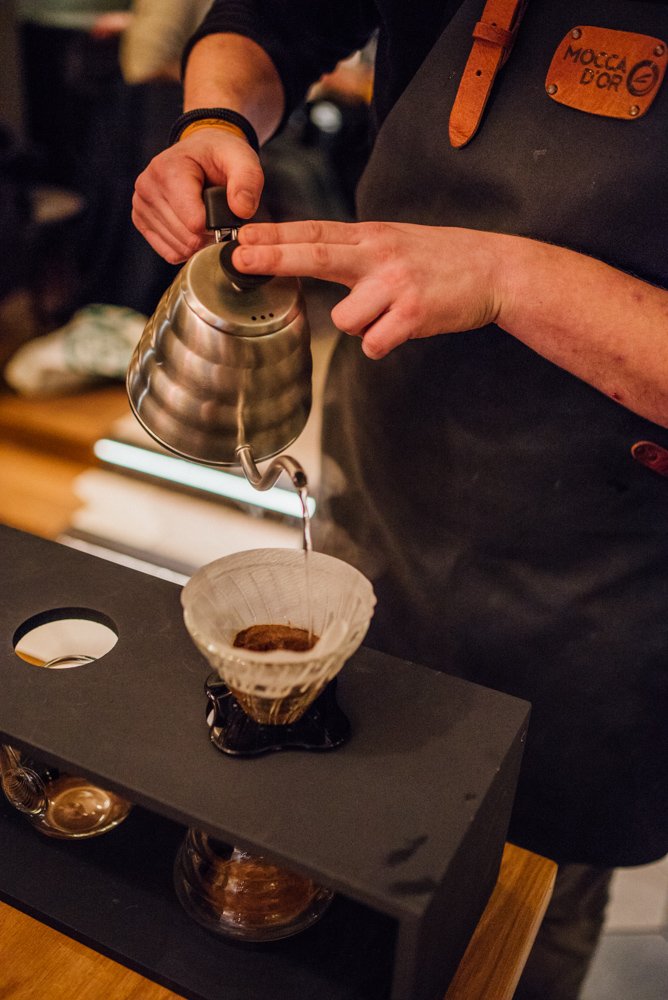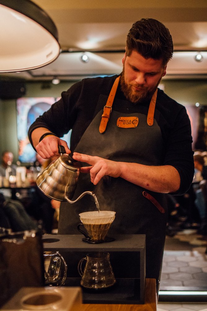 Joël laat ons tijdens de masterclass zien hoe hij het water in cirkels en met beleid de filter in giet (in maximaal drie minuten, anders wordt de koffie bitter). Hierdoor komt het water met alle korrels in aanraking. De koffie die het eerst door de filter loopt is sterker dan het laatste beetje. Roer daarom de koffie even door, voordat je deze uitschenkt.